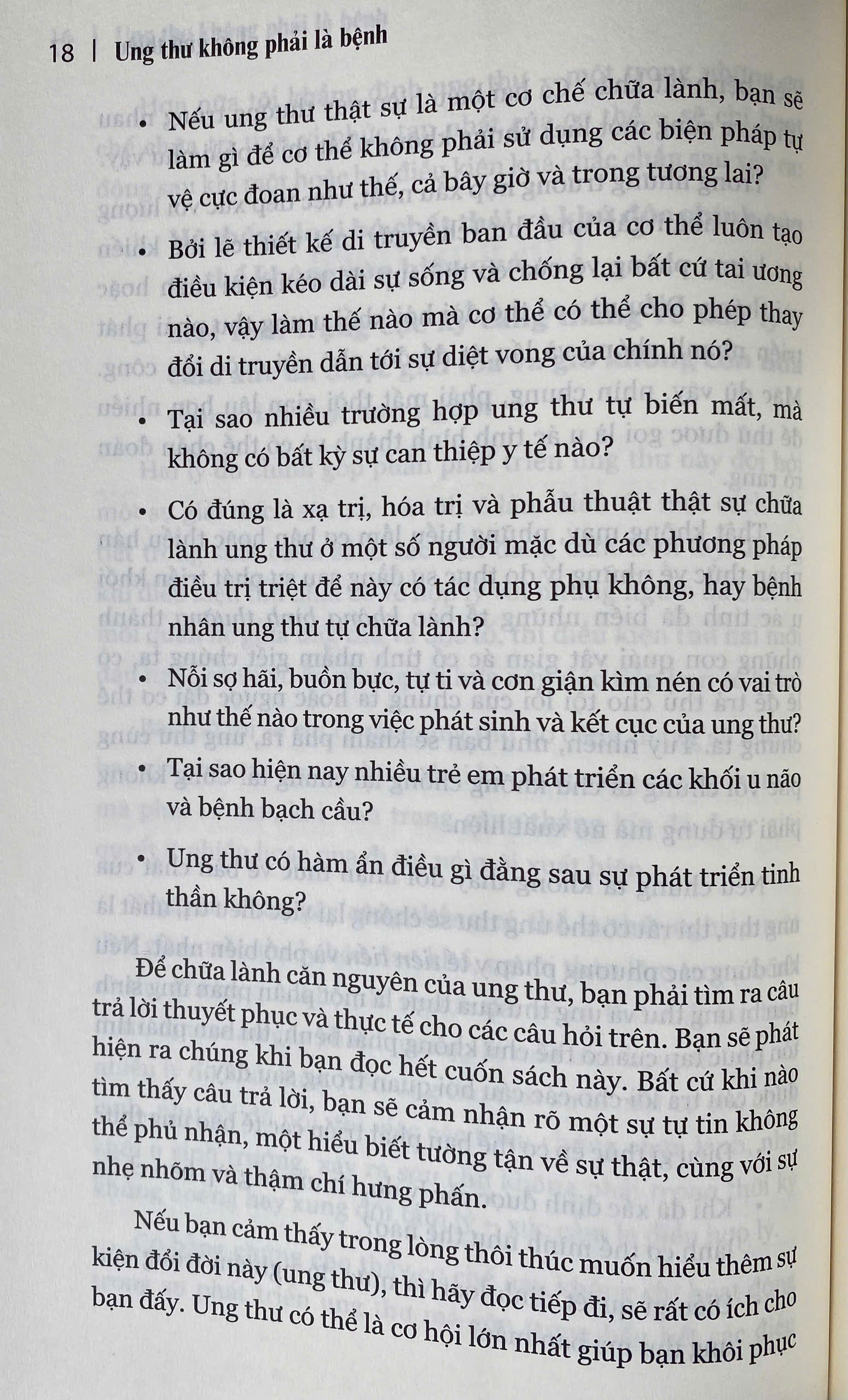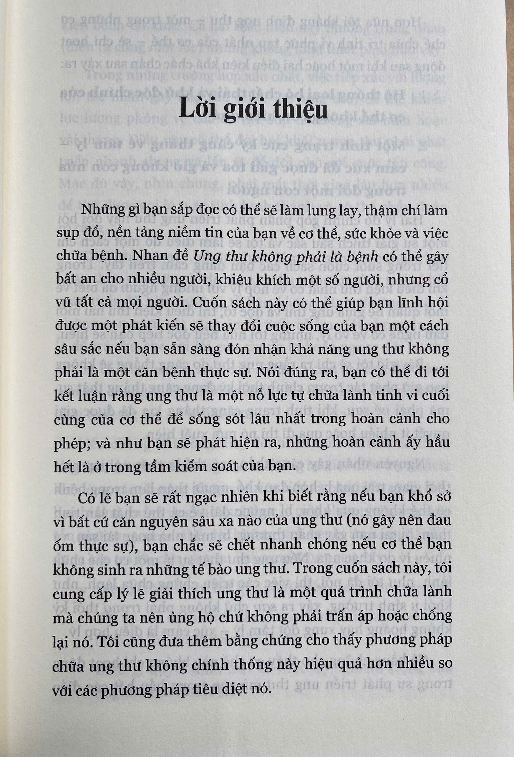 Những gì bạn sắp đọc có thể sẽ làm lung lay, thậm chí làm sụp đổ, nền tảng niềm tin của bạn về cơ thể, sức khỏe và việc chữa bệnh. Nhan đề Ung thư không phải là bệnh có thể gây bất an cho nhiều người, khiêu khích một số người, nhưng cổ vũ tất cả mọi người. Cuốn sách này có thể giúp bạn lĩnh hội được một phát kiến sẽ thay đổi cuộc sống của bạn một cách sâu sắc nếu bạn sẵn sàng đón nhận khả năng ung thư không phải là một căn bệnh thực sự. Nói đúng ra, bạn có thể đi tới kết luận rằng ung thư là một nỗ lực tự chữa lành tinh vi cuối cùng của cơ thể để sống sót lâu nhất trong hoàn cảnh cho phép; và như bạn sẽ phát hiện ra, những hoàn cảnh ấy hầu hết là ở trong tầm kiểm soát của bạn.
