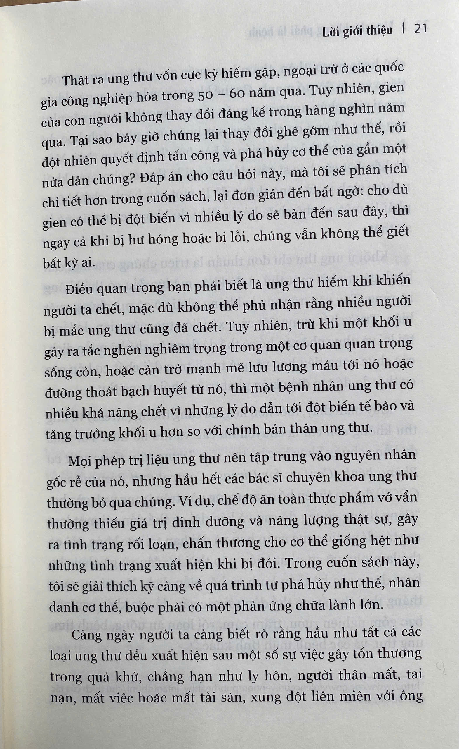 Có lẽ bạn sẽ rất ngạc nhiên khi biết rằng nếu bạn khổ sở vì bất cứ căn nguyên sâu xa nào của ung thư (nó gây nên đau ốm thực sự), bạn chắc sẽ chết nhanh chóng nếu cơ thể bạn không sinh ra những tế bào ung thư. Trong cuốn sách này, tác giả cung cấp lý lẽ giải thích ung thư là một quá trình chữa lành mà chúng ta nên ủng hộ chứ không phải trấn áp hoặc chống lại nó. Tác giả cũng đưa thêm bằng chứng cho thấy phương pháp chữa ung thư không chính thống này hiệu quả hơn nhiều so với các phương pháp tiêu diệt nó.