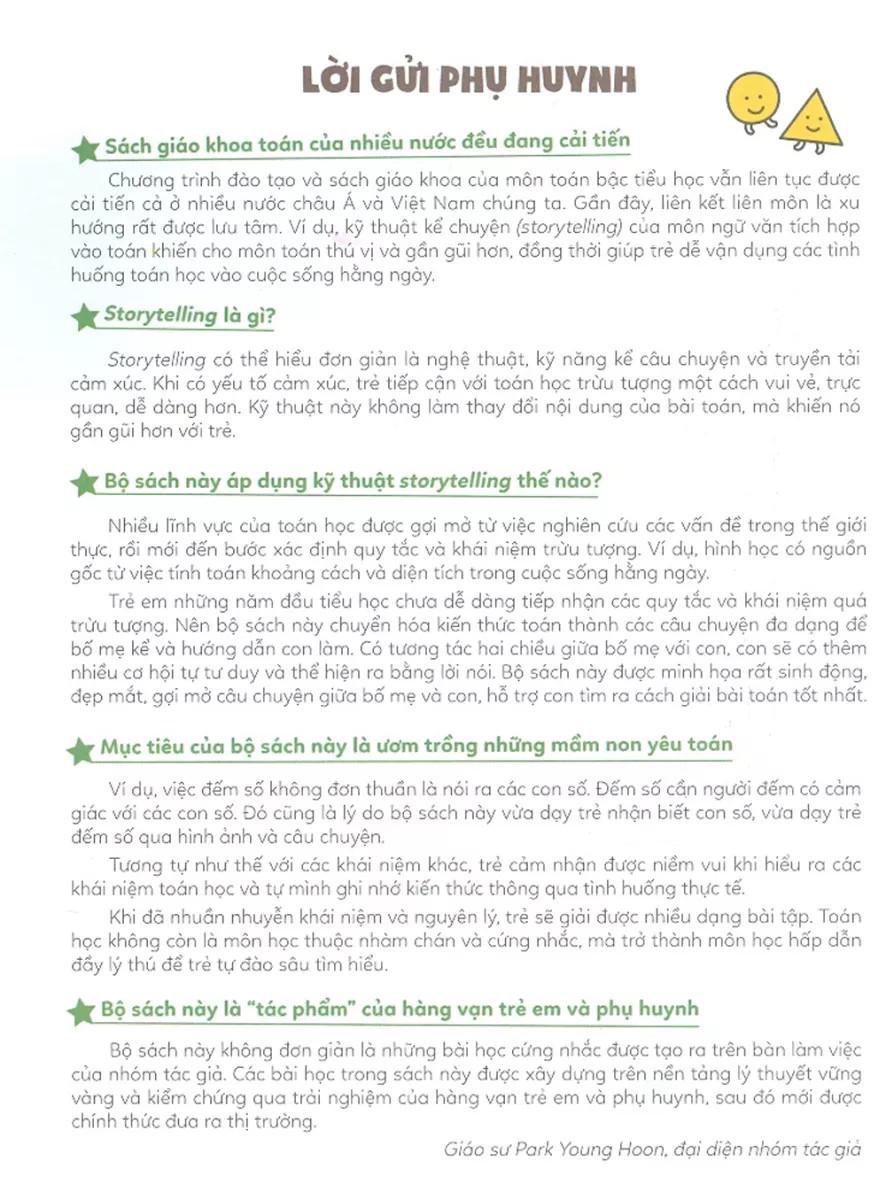 Trẻ em ở tuổi sắp đi học và những năm đầu tiểu học khó tiếp thu các quy tắc và khái niệm quá trừu tượng. Bộ sách này chuyển hóa kiến thức toán thành các câu chuyện đa dạng có minh họa để bố mẹ dễ làm cùng trẻ. Được tương tác hai chiều với bố mẹ, trẻ sẽ có thêm nhiều cơ hội tự tư duy và thể hiện ra bằng lời nói.