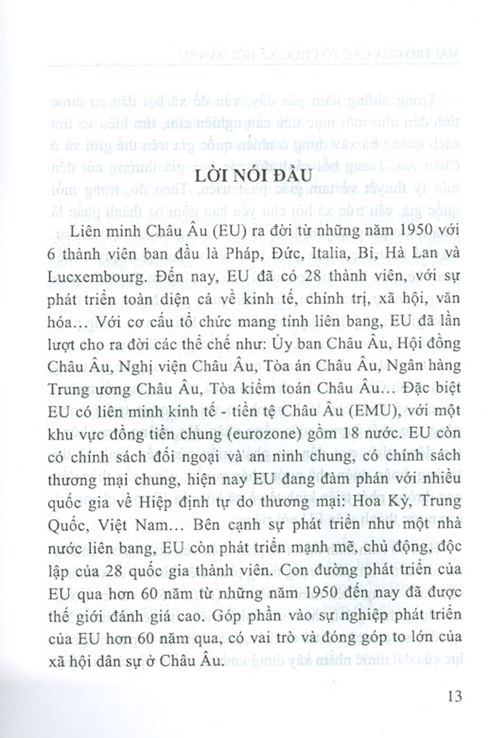 Thực tiễn hơn 60 năm hình thành và phát triển vừa qua ở nhiều quốc gia trong Liên minh Châu Âu (EU) cho thấy, một XHDS với những cơ cấu và thiết chế lành mạnh có vai trò quan trọng trong nâng cao chất lượng cuộc sống người dân, thông qua những tác động tích cực đến sự phát triển của nền kinh tế thi trường, hoàn thiện nhà nước pháp quyền, góp phần thúc đẩy con đường phát triển kinh tế và xã hội của EU nói chung và các nước thành viên EU nói riêng. Ngày nay, thừa nhận giá trị và phát huy vai trò của XHDS trong phát triển là xu hướng chung của các quốc gia, khu vực trên thế giới, trong đó có Việt Nam. Việc nghiên cứu có hệ thống từ lý thuyết đến thực tiễn vai trò của các tổ chức XHDS trong sự phát triển kinh tế và xã hội ở một số nước EU hiện nay là rất cần thiết. Từ đó có thể gợi mở nhiều điều cho Việt Nam, đặc biệt trong bối cảnh Việt Nam đang tích cực hội nhập sâu sắc vào nền kinh tế thế giới, đang phát huy mọi nguồn lực đất nước để thực hiện thành công sự nghiệp công nghiệp hóa vào năm 2020. Để hiểu rõ hơn về XHDS và vai trò của XHDS trong phát triển kinh tế xã hội, năm 2018, Nhà xuất bản Khoa học xã hội xuất bản cuốn sách chuyên khảo: “Vai trò của các tổ chức xã hội dân sự trong phát triển kinh tế và xã hội ở một số quốc gia trong Liên minh Châu Âu” do PGS.TS. Đinh Công Tuấn và TS. Đinh Công Hoàng đồng chủ biên.