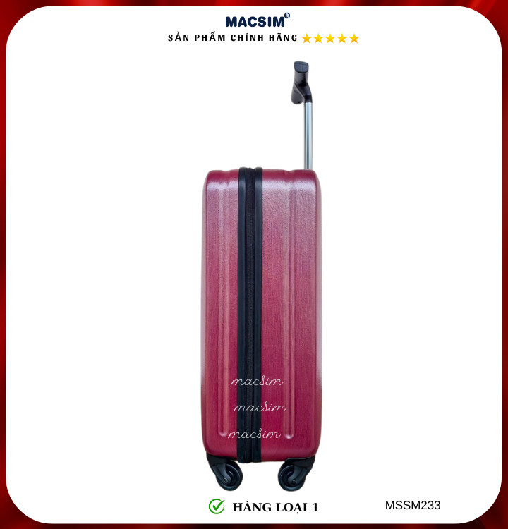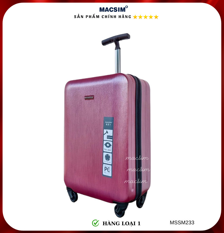 Vali Macsim được làm từ chất liệu nhựa nguyên chất PC. Tấm lót bên trong Poliester 150D xuất xứ Trung Quốc được REACH kiểm nghiệm và phê duyệt, bánh xe 360 độ hãng Hinomoto của Nhật ; Khóa kéo thương hiệu SBS xuất xứ Trung Quốc, Khóa TSA hãng Master Lock của Mỹ. Thiết kế vali đơn giản lịch lãm vô cùng sang trọng, bền bỉ, tạo dấu ấn phong cách thời trang cá nhân của bạn trên mọi cuộc hành trình. Vali cao cấp Macssim thích hợp với những người thường xuyên di chuyển cần chiếc vali nhẹ, có độ bền tốt.