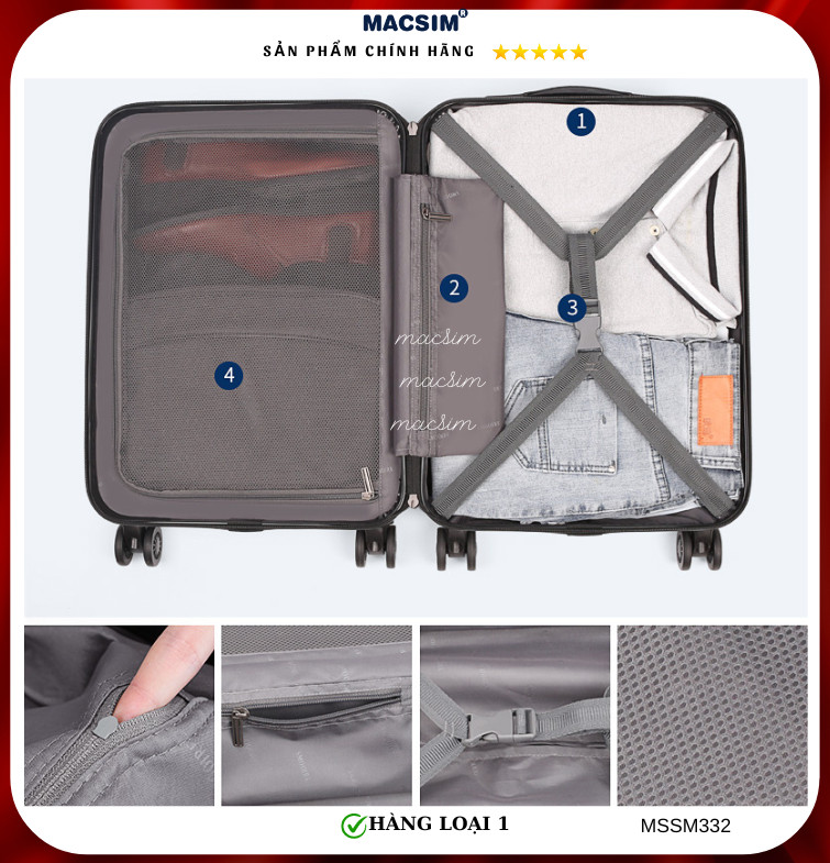 Vali Macsim được làm từ chất liệu nhựa nguyên chất PC. Tấm lót bên trong Poliester 150D xuất xứ Trung Quốc được REACH kiểm nghiệm và phê duyệt, bánh xe 360 độ hãng Hinomoto của Nhật ; Khóa kéo thương hiệu SBS xuất xứ Trung Quốc, Khóa TSA hãng Master Lock của Mỹ.  Thiết kế vali đơn giản lịch lãm vô cùng sang trọng, bền bỉ, tạo dấu ấn phong cách thời trang cá nhân của bạn trên mọi cuộc hành trình. Vali cao cấp Macssim thích hợp với những người thường xuyên di chuyển cần chiếc vali nhẹ, có độ bền tốt.