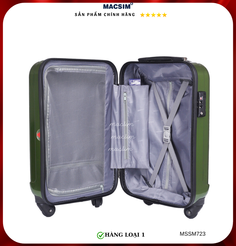 Vali Macsim được làm từ chất liệu nhựa nguyên chất PC. Tấm lót bên trong Poliester 150D xuất xứ Trung Quốc được REACH kiểm nghiệm và phê duyệt, bánh xe 360 độ hãng Hinomoto của Nhật ; Khóa kéo thương hiệu SBS xuất xứ Trung Quốc, Khóa TSA hãng Master Lock của Mỹ.  Thiết kế vali đơn giản lịch lãm vô cùng sang trọng, bền bỉ, tạo dấu ấn phong cách thời trang cá nhân của bạn trên mọi cuộc hành trình. Vali cao cấp Macssim thích hợp với những người thường xuyên di chuyển cần chiếc vali nhẹ, có độ bền tốt.