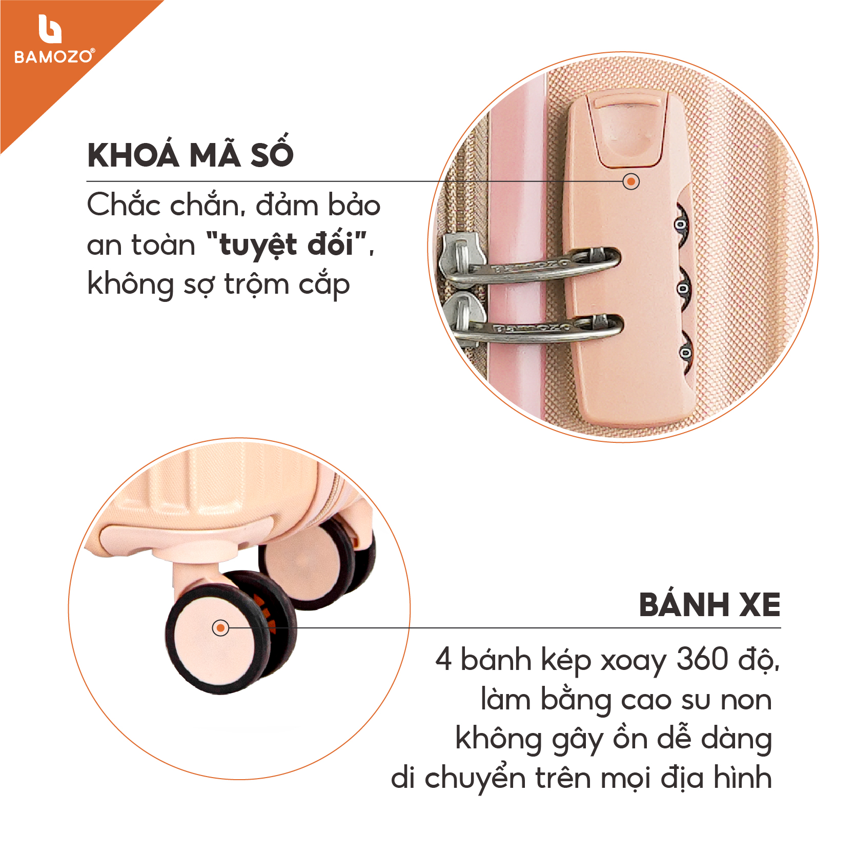 - Có các đặc điểm nổi bật như sau : 1. Khóa TSA theo tiêu chuẩn Hoa Kỳ 2. Bánh xe đơn xoay 360 độ 3. Nội thất gồm 1 ngăn khóa lưới & 1