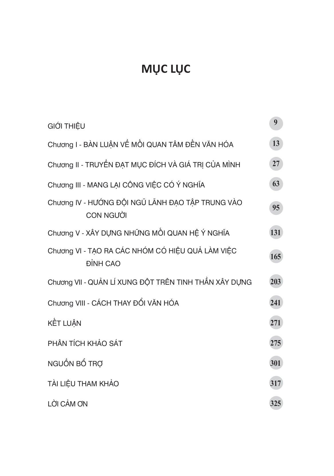 Với cuốn sách này, bạn sẽ: KHÁM PHÁ 6 YẾU TÔ CƠ BẢN TẠO NÊN MỘT VĂN HÓA TỔ CHỨC LÀNH MẠNH Văn hóa tổ chức là gì? Hầu hết chúng ta đều biết những câu chuyện từ một số nơi “tuyệt nhất” để làm việc – những Google của thế giới, với những khu ăn uống đáng ngưỡng mộ, những tòa nhà lộng lẫy, dịch vụ mát-xa miễn phí và những bàn chơi bi lắc. Những người ra quyết định ở nhiều công ty kể trên có thể cảm thấy các đãi ngộ thêm này sẽ giúp tổ chức của mình trở thành nơi làm việc tuyệt vời, và kết quả là họ sẽ thu hút cũng như giữ chân được những nhân viên tài năng, nhiệt tình, hiệu quả. Những sáng kiến này nghe có vẻ tuyệt vời, và quả thực chúng có thể giúp tạo ra nhiều tổ chức vui vẻ và hiệu quả hơn. Tuy nhiên, thực tế là hầu hết các công ty không có đủ nguồn lực để triển khai những chương trình kiểu này. Điều đáng mừng là, dù nghe có vẻ hay ho song những đãi ngộ này không thực sự cần thiết để thu hút được những nhân viên hiệu quả và tận tâm, những người yêu thích công việc và trung thành với tổ chức mình. Thay vào đó, điều mấu chốt là xây dựng một văn hóa tổ chức lành mạnh. Xây dựng văn hóa trong tổ chức như thế nào? Nếu bạn muốn biến tổ chức của mình thành một nơi làm việc tuyệt vời, văn hóa phải được ưu tiên hàng đầu. Ngay cả khi tổ chức của bạn cân nhắc đến phòng chơi game hay đồ ăn sang chảnh miễn phí, thì chỉ riêng những đãi ngộ này thôi cũng sẽ không thể tạo nên một văn hóa lành mạnh nếu như bạn không tính đến cả những ưu tiên được nêu ra trong 6 chương của cuốn sách: Truyền đạt mục đích & các giá trị của mình. Nhân viên được truyền cảm hứng khi họ đồng điệu với mục đích và các giá trị của tổ chức nơi họ làm việc. Mang lại công việc có ý nghĩa. Hầu hết nhân viên muốn làm việc trong những dự án truyền cho họ cảm hứng, phù hợp với thế mạnh của họ và giúp họ phát triển. Hướng đội ngũ lãnh đạo tập trung vào con người. Cách lãnh đạo kết nối với nhân viên ảnh hưởng lớn đến cách mọi người cảm nhận về nơi họ làm việc. Xây dựng các mối quan hệ có ý nghĩa. Khi nhân viên yêu quý đồng nghiệp và cấp trên, họ sẽ cảm thấy thỏa mãn và gắn bó với công việc hơn. Tạo ra các nhóm làm việc có hiệu quả đỉnh cao. Mọi người tràn đầy năng lượng khi làm việc hiệu quả cùng nhau vì các nhóm đạt được những thành tích mà không một cá nhân nào có thể tự mình làm được. Tiến hành quản lí xung đột trên tinh thần xây dựng. Khi lãnh đạo không thể xử lí tốt và kịp thời xung đột, thì xung đột sẽ nhanh chóng hủy hoại nơi làm việc. Văn hóa tổ chức là yếu tố quan trọng nhất ảnh hưởng đến hạnh phúc, các mối quan hệ công việc và mức độ hài lòng với công việc. Hiểu rõ văn hóa tổ chức là gì và văn hóa tổ chức của chính nơi bạn làm việc là gì sẽ giúp bạn dễ dàng xác định các vấn đề và phát triển các chiến lược để tạo nên một văn hóa tốt đẹp hơn, đồng thời tận dụng được năng lượng tích cực của văn hóa đó. Văn hóa tổ chức bao gồm các yếu tố như giá trị, sứ mệnh, phong cách lãnh đạo, kì vọng vào cách nhân viên cư xử với khách hàng và cư xử với nhau. Văn hóa hiện hữu qua cách con người tương tác với nhau – hành vi của họ. Văn hóa được phản ảnh qua cách mọi việc được hoàn thành. Văn hóa cấu tạo từ những nguyên tắc và chuẩn mực gắn kết tổ chức lại thành một khối. CUỐN SÁCH NÀY DÀNH CHO AI? Nếu đã chọn cuốn sách này, thì nhiều khả năng bạn đang không hài lòng với văn hóa tổ chức của mình, hoặc có thể bạn nghĩ rằng ít ra văn hóa ấy có thể trở nên tốt hơn so với hiện tại. Nếu trong thâm tâm bạn nghĩ rằng có một cách tốt hơn, rằng mọi thứ không thể cứ mãi thế này được, thì cuốn sách này là dành cho bạn. Nếu bạn lờ mờ nhận ra điều gì đó nhưng không biết chắc cách để tác động đến sự thay đổi văn hóa tại nơi làm việc của mình, thì cuốn sách này là dành cho bạn. Nếu bạn là một trong những cá nhân may mắn được làm việc trong một tổ chức có văn hóa mạnh mẽ, nhưng lại không biết chắc cách để duy trì sức mạnh đó khi bạn phát triển, thay đổi và đối mặt với tương lai, thì cuốn sách này là dành cho bạn. Nếu bạn là một nhà lãnh đạo muốn chủ động trau dồi một văn hóa tổ chức lành mạnh, thì cuốn sách này là dành cho bạn. Lãnh đạo chịu phần lớn trách nhiệm cho tình trạng của văn hóa tổ chức, nhưng mọi người ở tổ chức đều có một vai trò trong việc tác động và duy trì văn hóa đó. Xuyên suốt cuốn sách, chúng tôi sử dụng cụm từ “nhà lãnh đạo” theo nghĩa bao hàm để chỉ tất cả những người có ảnh hưởng đến người khác tại nơi làm việc. Cuốn sách này có thể áp dụng cho người giám sát, quản lí, giám đốc, quản lí nhân sự, đại biểu công đoàn và những