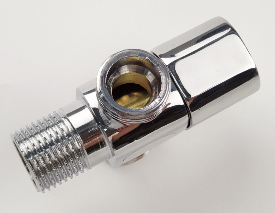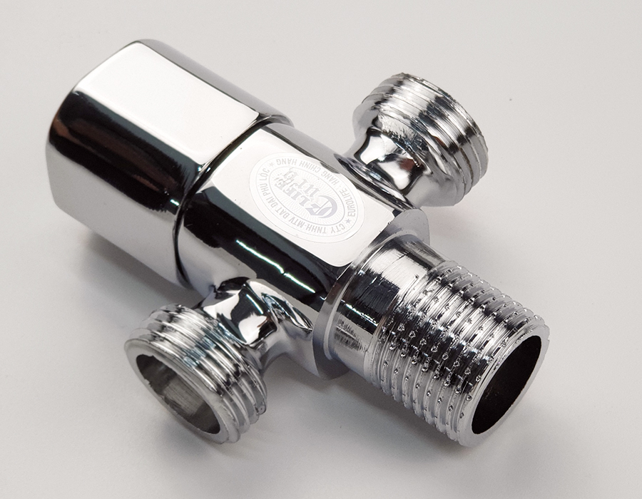 Van khóa chữ T chia hai đường nước 1 ngã cấp nước vào bồn cầu dây xịt vệ sinh, 1 ngã dùm để giảm áp lực nước Thân van được làm bằng đồng mạ chrome,