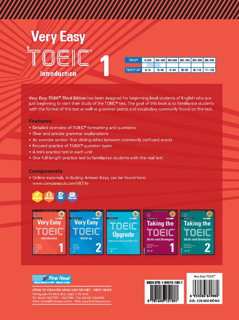 Giá bộ: 446.000VNĐ ------------ 1. VERY EASY TOEIC 1 Tác Giả: Nhiều tác giả Năm phát hành: 2020 Số trang: 240 Kích thước: 21 x 27.8 cm NXB: NXB Compass Publishing Giá bìa: 228.000VND Mô