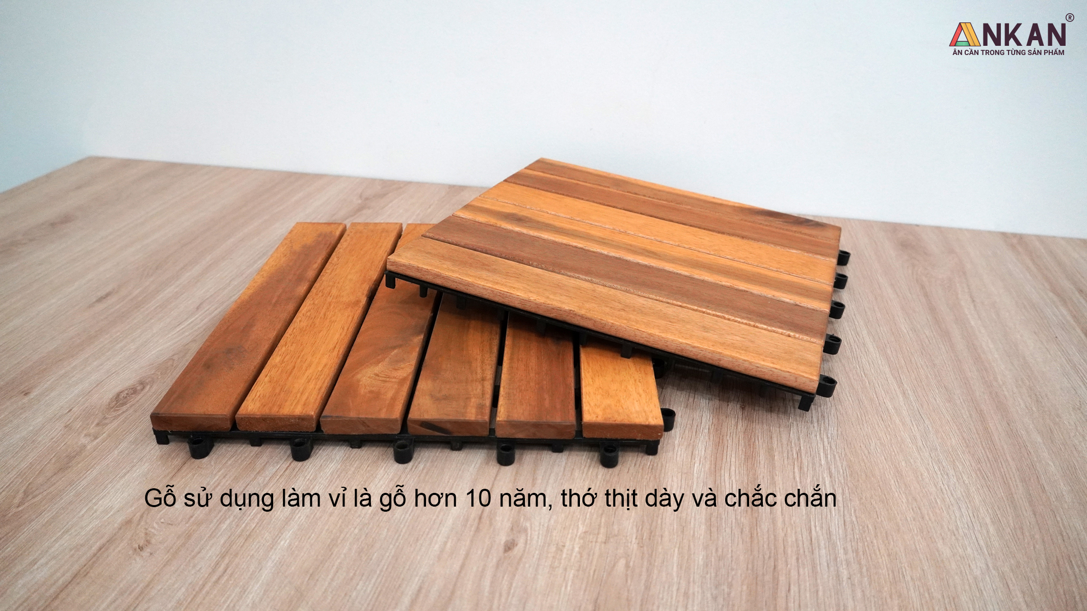 Mua tại TiktokVán gỗ lót sàn ban công 6 nan là vỉ gỗ đẹp và dễ lắp đặt nhất và bán chạy nhất trong tất cả các loại vỉ hiện này. Sản phẩm này còn được xuất khẩu sang nhiều quốc gia như Nhật Bản, Đức và Mỹ. Chúng ta hãy cùng nhau xem qua sản phẩm này nhé. CHI TIẾT VÁN GỖ LÓT BAN CÔNG 6 NAN Tên sản phẩm: Vỉ gỗ lót sàn, ván sàn gỗ vỉ nhựa, sàn gỗ vỉ nhựa, sàn gỗ lót ban công, tấm ván sàn gỗ. Thương hiệu ANKAN Kích thước 30cm x 30cm x 2.4cm Độ dày phần gỗ 1.2cm Loại gỗ Gỗ tràm bông vàng đạt chuấn xuất khẩu Châu Âu. Loại đế nhựa: Nhựa PP loại tốt, chịu được sức nặng của xe bán tải. Màu sắc Màu vàng nắng Kỹ thuật màu Dầu gốc nước, an toàn cho người sử dụng, đạt tiêu chuẩn của TUV ƯU ĐIỂM CỦA VÁN GỖ LÓT BAN CÔNG 6 NAN