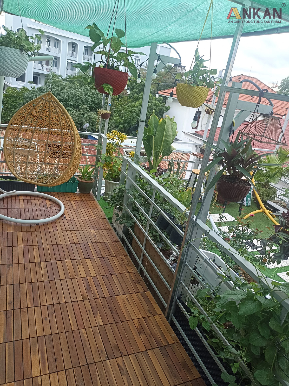 - Việc sử dụng chất liệu gỗ để lót sàn giúp đồng điệu với cây xanh, tranh trí tiểu cảnh ở ban công.