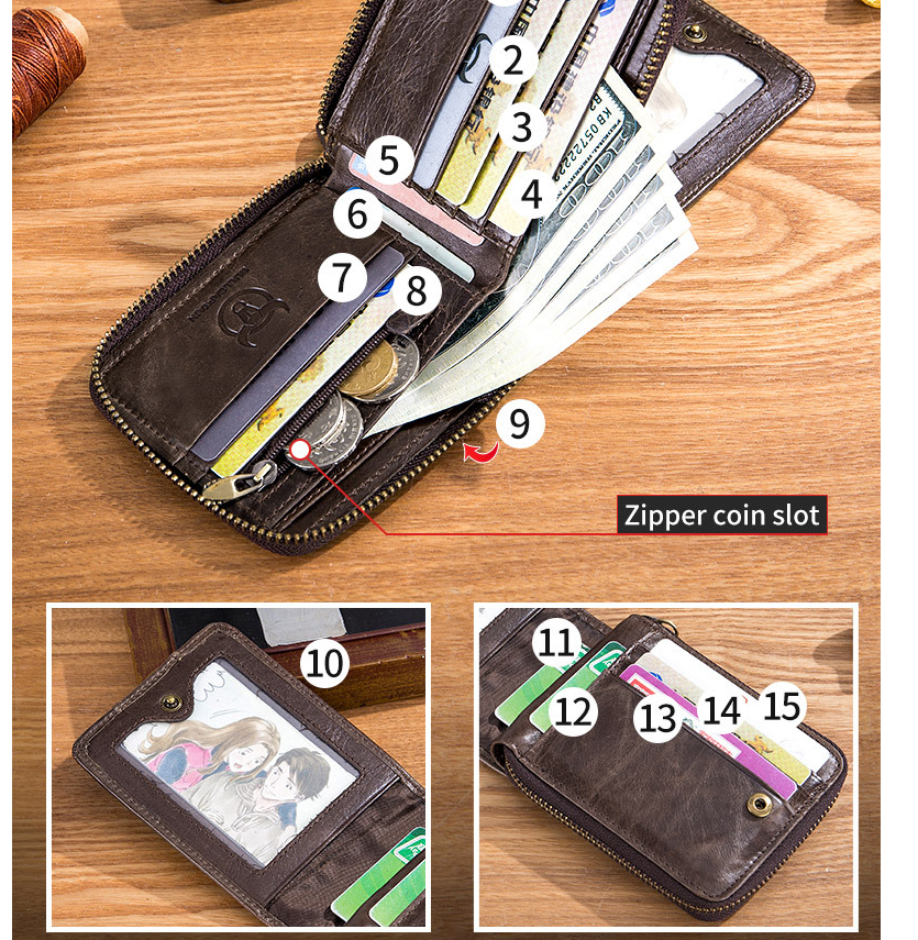 - Màu sắc : Đen, Nâu - Kích thước : 12 x 10.5 cm - Chất liệu : 100% Da bò - Thiết kế gồm 2 ngăn lớn, 1 ngăn dây kéo cùng nhiều ngăn