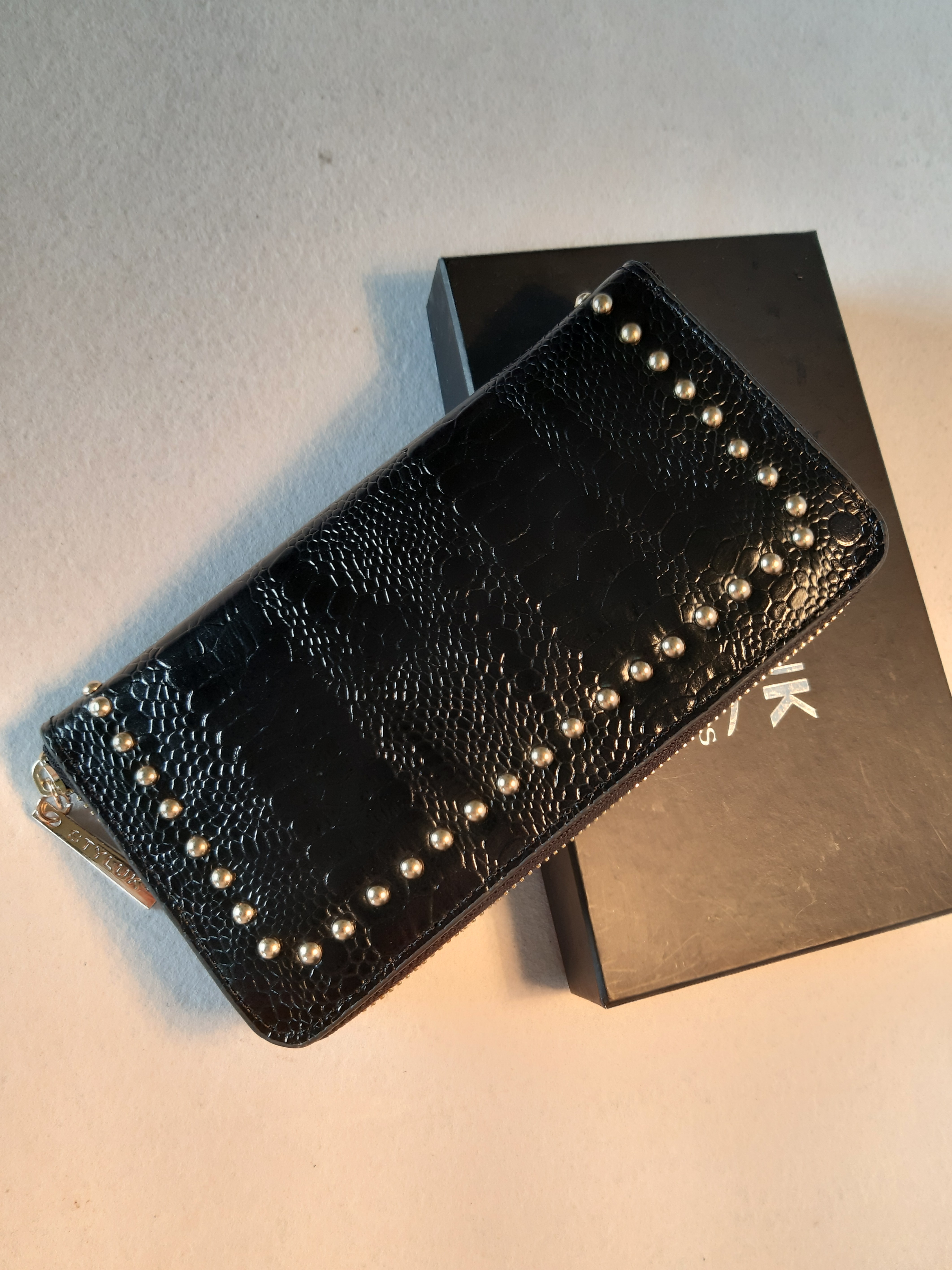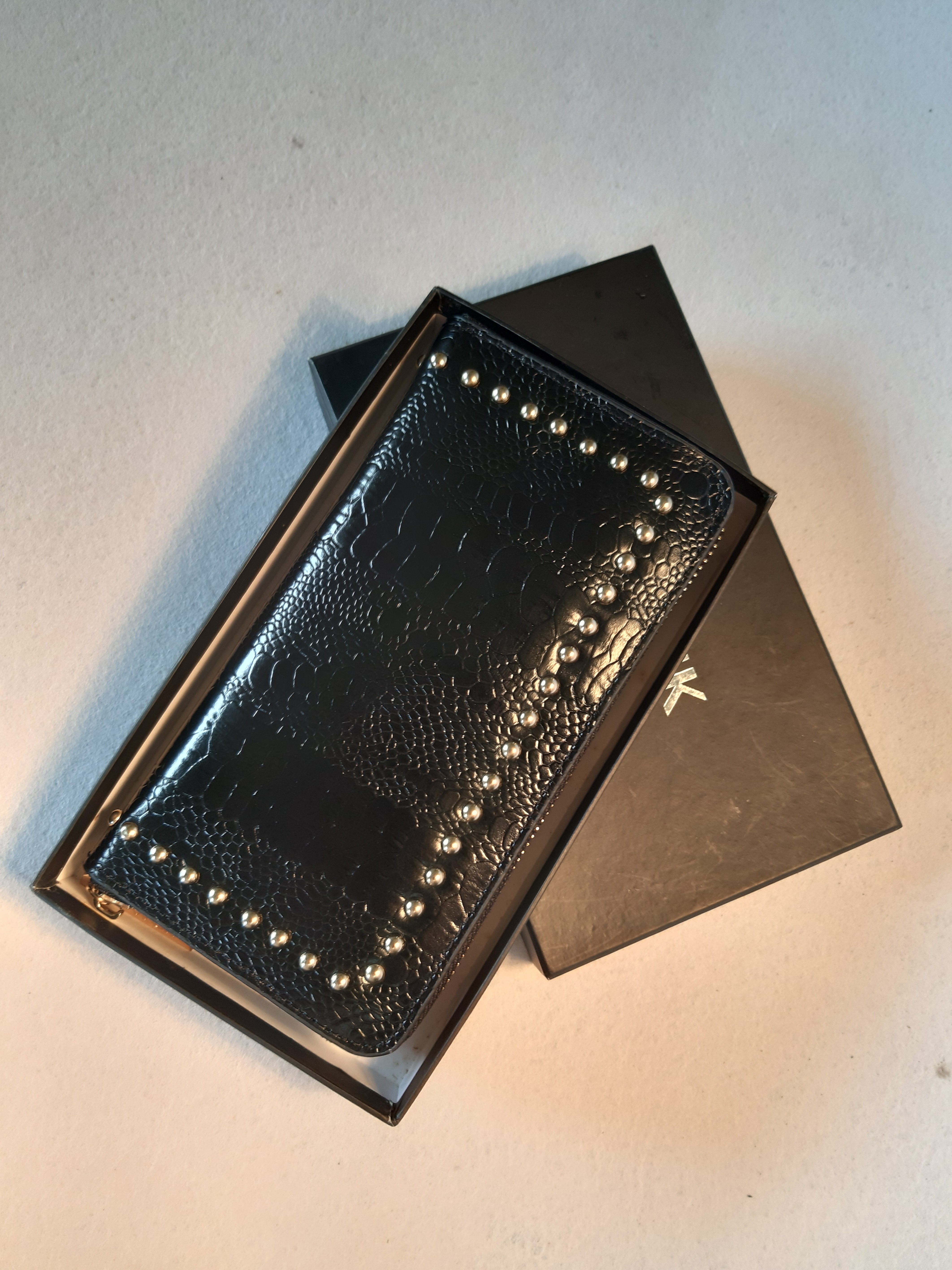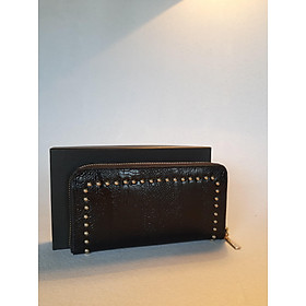 Bề mặt ví được dập chìm nổi theo vân cá sấu, cộng thêm trang trí những đinh nhỏ tạo điểm nhấn cho người dùng