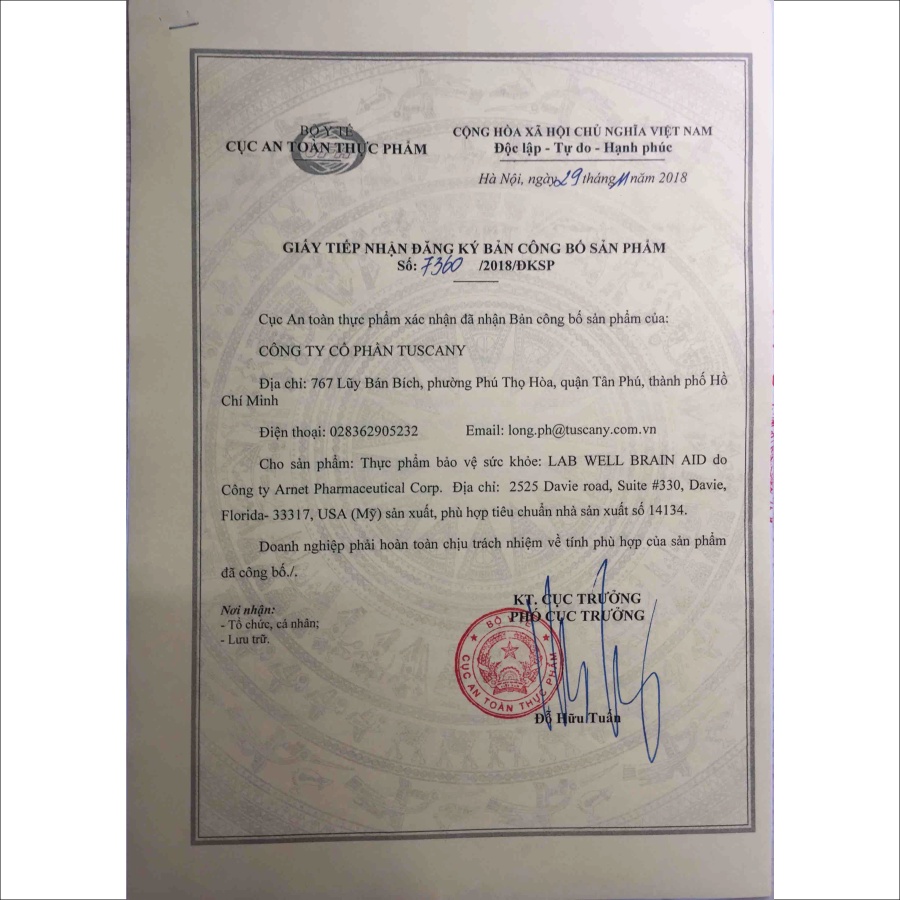 - Xuất xứ hàng hóa: ARNET PARMACEUTICAL CORP - MỸ - Nhâp khẩu: CÔNG TY CỔ PHẦN TUSCANY - MỸ - Địa chỉ nhập khẩu: 767 Lũy Bán Bích, P.Phú Thọ Hòa, Q.Tân