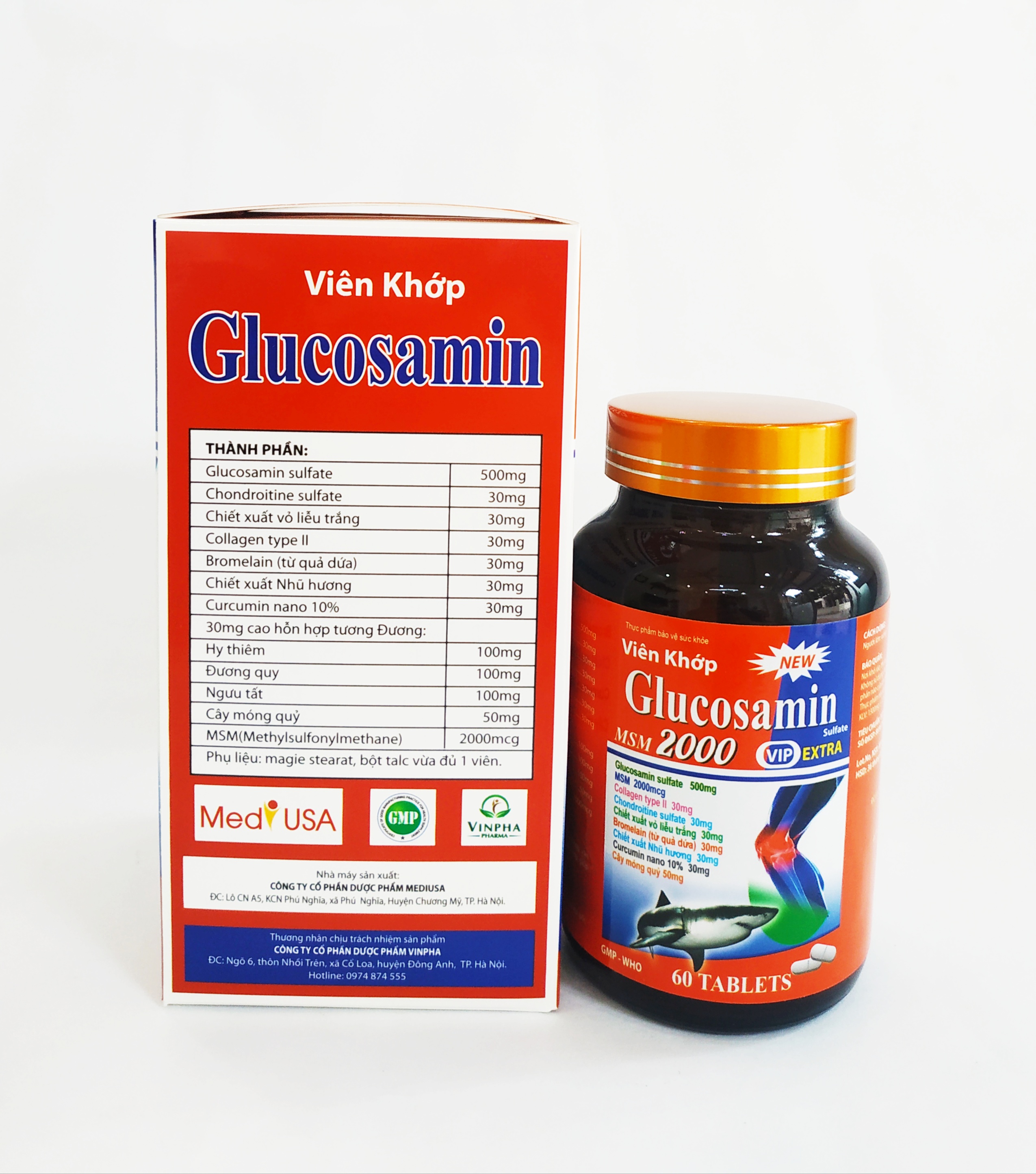 Thành phần : Trong mỗi viên nén có chứa: - Glucosamin sulphate 2 NaCl 750mg. - MSM (Methysulfonylmethane) 50mg, Calci gluconate 100mg, Cao xương ngựa bạch 70mg, Chondroitin sulphate 50mg, Collagen type II 30mg, sụn