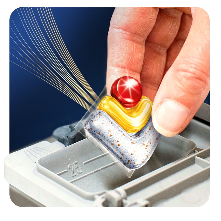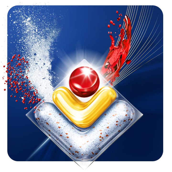Viên nang ba ngăn loại bỏ hiệu quả tất cả các cặn thức ăn - mà không cần rửa trước. Chúng bảo vệ chống ăn mòn thủy tinh và đồng thời ngăn chặn sự tích tụ cặn trong máy rửa chén.