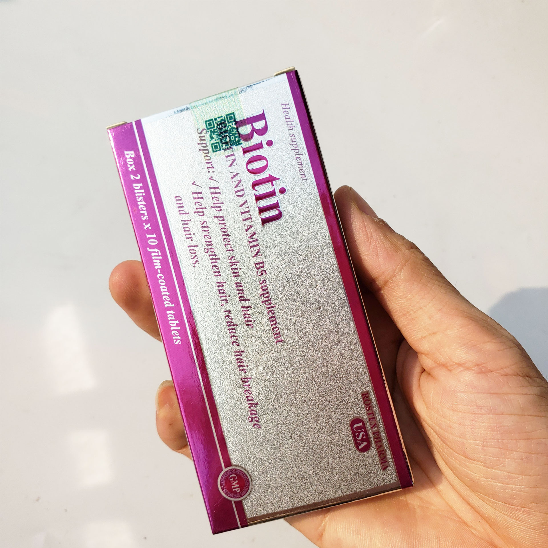 Thực phẩm bảo vệ sức khỏe ROSTEX PHARMA USA Biotin Bổ sung: BIOTIN, VITAMIN B5 Hỗ trợ: Giúp bảo vệ da, tóc Giúp tóc chắc khỏe, giảm gãy, rụng tóc. 1. THÀNH PHẦN Biotin: 5