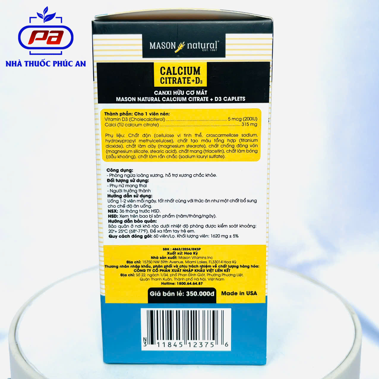 Mua tại TiktokViên uống bổ sung Canxi hữu cơ + Vitamin D3 cho bà bầu Mason Natural Calcium Citrate + D3 Mỹ 60 viên THÔNG TIN SẢN PHẨM: