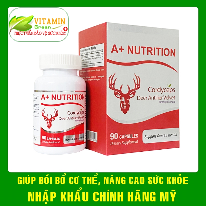 A+ Nutrition Codysceps Deer là thực phẩm bảo vệ sức khỏe được nhập khẩu chính hãng từ Mỹ, A+ Nutrition Codysceps Deer với công thức vàng kết hợp Đông trùng hạ thảo và Nhung hưu tạo nên 1 sản phẩm cao cấp mang lại nhiều lợi ích cho sức khỏe, giúp tăng cường sức đề kháng, Bổ sung dưỡng chất thiết yếu, giúp cơ thể chống lại các tác nhân gây bệnh từ bên ngoài, giúp bạn luôn tràn đầy năng lượng cho ngày dài hoạt động. Ngoài ra còn giúp tăng cường trí nhớ và khả năng tập trung. A+ Nutrition Codysceps Deer  với nồng độ chiết xuất hóa 100% theo tiêu chuẩn Mỹ: Đảm bảo chất lượng và hiệu quả tối ưu. Hàm lượng 500mg Nhung Hươu cao Cung cấp dưỡng chất quý giá cho sức khỏe. 100% sản xuất và nhập khẩu trực tiếp từ Mỹ: Đạt chứng nhận FDA, đảm bảo an toàn và chất lượng CÔNG DỤNG CỦA A+ Nutrition Codysceps Deer :