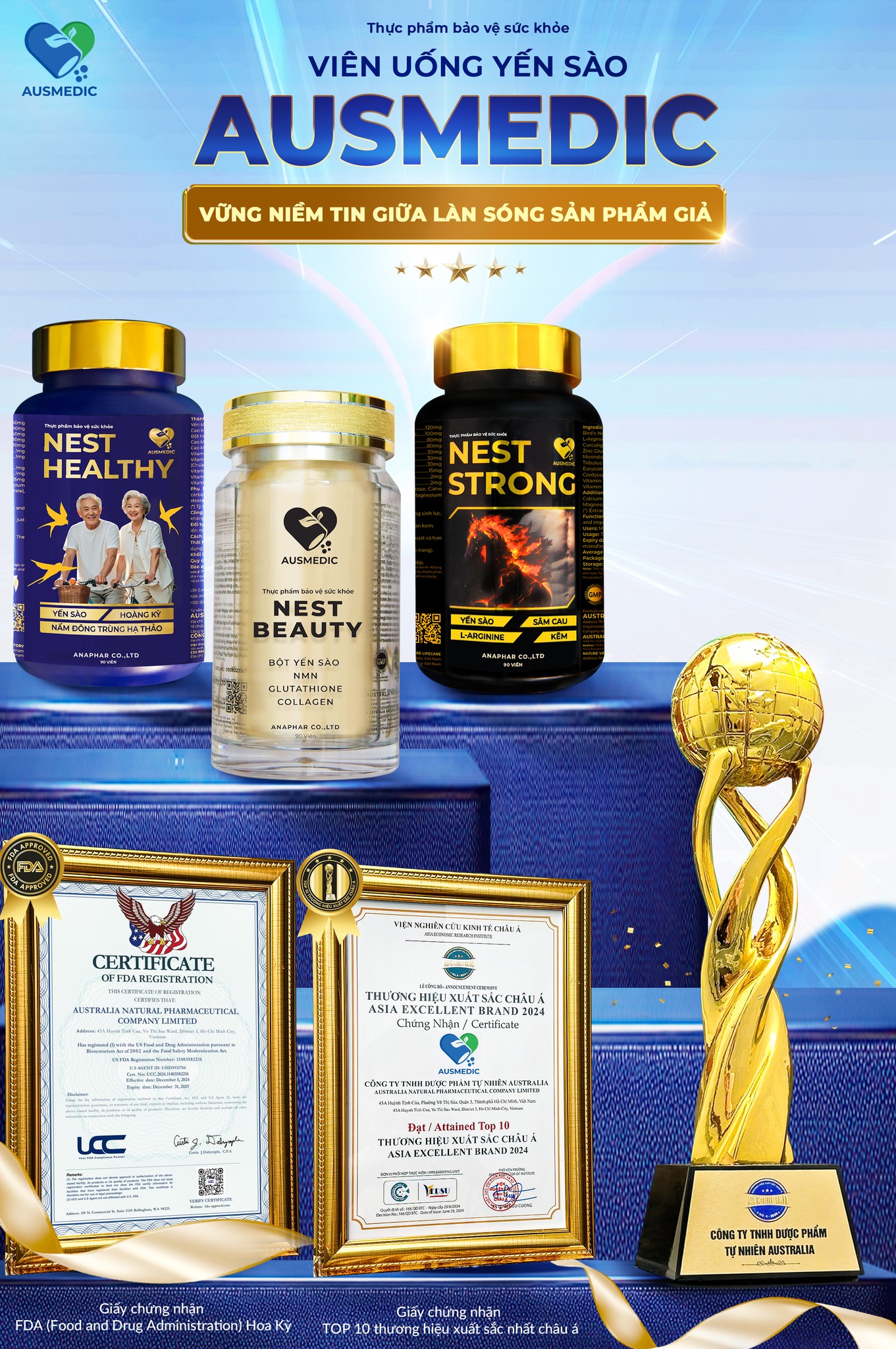 - Nest Strong từ thương hiệu Ausmedic là viên uống yến sào tiê.n phon.g tại Việt Nam với công thức độc quyền kết hợp 100% YẾN SÀO NGUYÊN CHẤT từ Cần Giờ cùng bộ tứ hoạt chất hỗ trợ tăng sinh lý (Sâm Cau, Ba Kích, L- Arginine và Kẽm) theo nồng độ chuẩn y khoa, giúp Hỗ trợ bổ thận, tráng dương, tăng cường sinh lực, giúp cải thiện sinh lý nam giới, tăng sinh tinh trùng, dễ sử dụng hơn yến chưng truyền thống, đã được kiểm nghiệm a.n toà.n đạt chuẩn FDA (Mỹ) và đạt kiểm nghiệm khắt khe của Bộ Y Tế Việt Nam (7121/2024). Mỗi viên Nest Strong là kết tinh công nghệ yến sào dạng viên tiê.n phon.g tại Việt Nam, giúp bảo toàn dưỡng chất – tiện lợi – dễ hấp thu – nhưng vẫn giữ nguyên hiệu quả như yến chưng truyền thống.