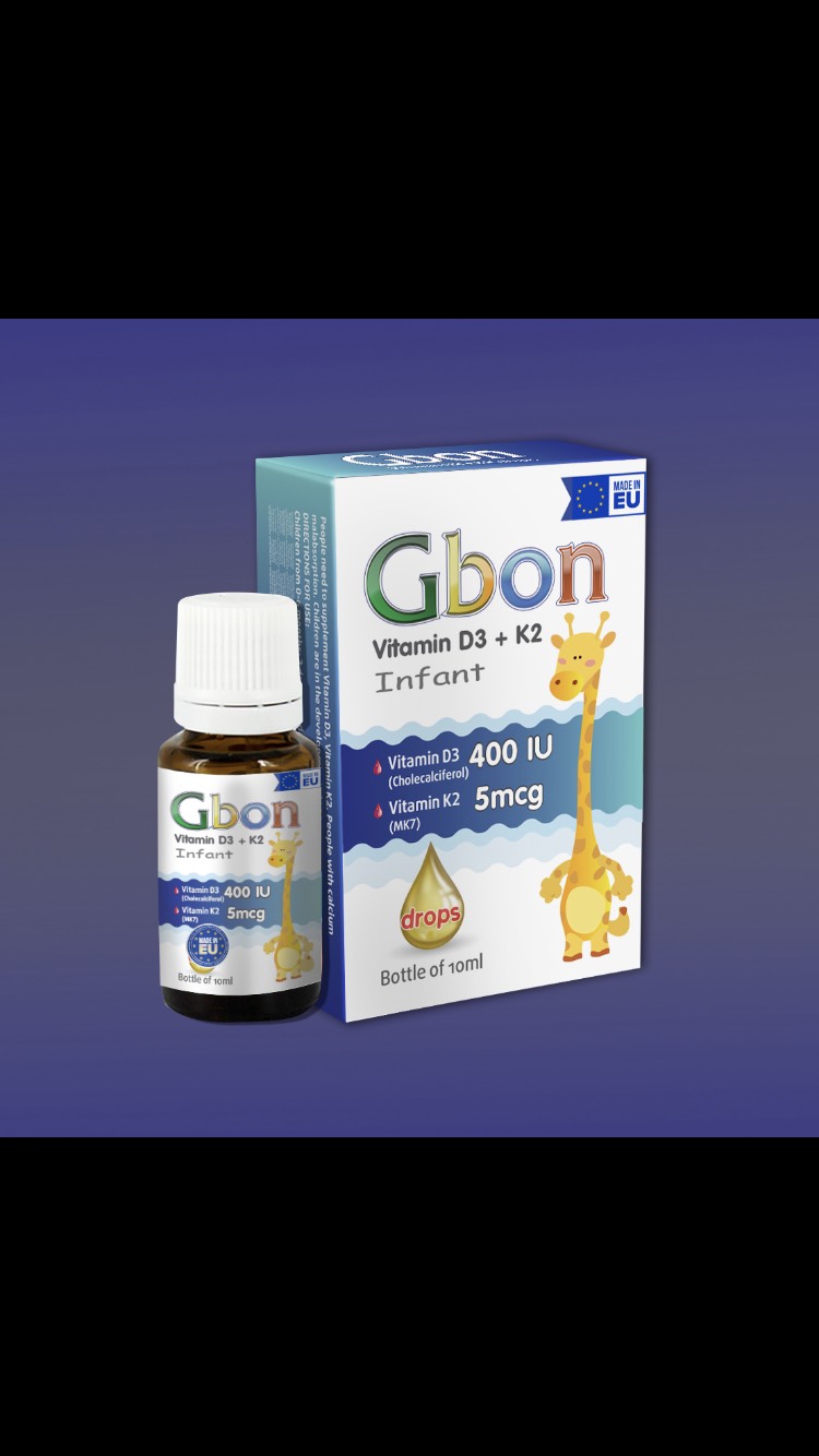 - Hỗ trợ phát triển chiều cao vượt trội cho trẻ sơ sinh và trẻ nhỏ. - Giúp trẻ phòng chống các bệnh lý còi xương, rối loạn giấc ngủ, trằn trọc, ngủ không sâu giấc, rụng tóc vành khăn do tình trạng thiếu canxi gây ra Thành phần có cả vitamin D3 và đặc biệt là thêm K2 hay còn gọi là MK7 giúp tăng hiệu quả hấp thu canxi vào xương, hỗ trợ tăng chiều cao tối đa Các mẹ hoàn toàn có thể yên tâm để sử dụng sản phẩm Gbon cho trẻ sơ sinh và trẻ nhỏ hàng ngày theo liều hướng dẫn, sẽ giúp bổ sung vitamin d3, k2 giúp trẻ phát triển toàn diện, tăng chiều cao tối ưu nhất là trong 1000 ngày đầu đời của trẻ Gbon có hàm lượng hoạt chất trong 5 giọt gồm: