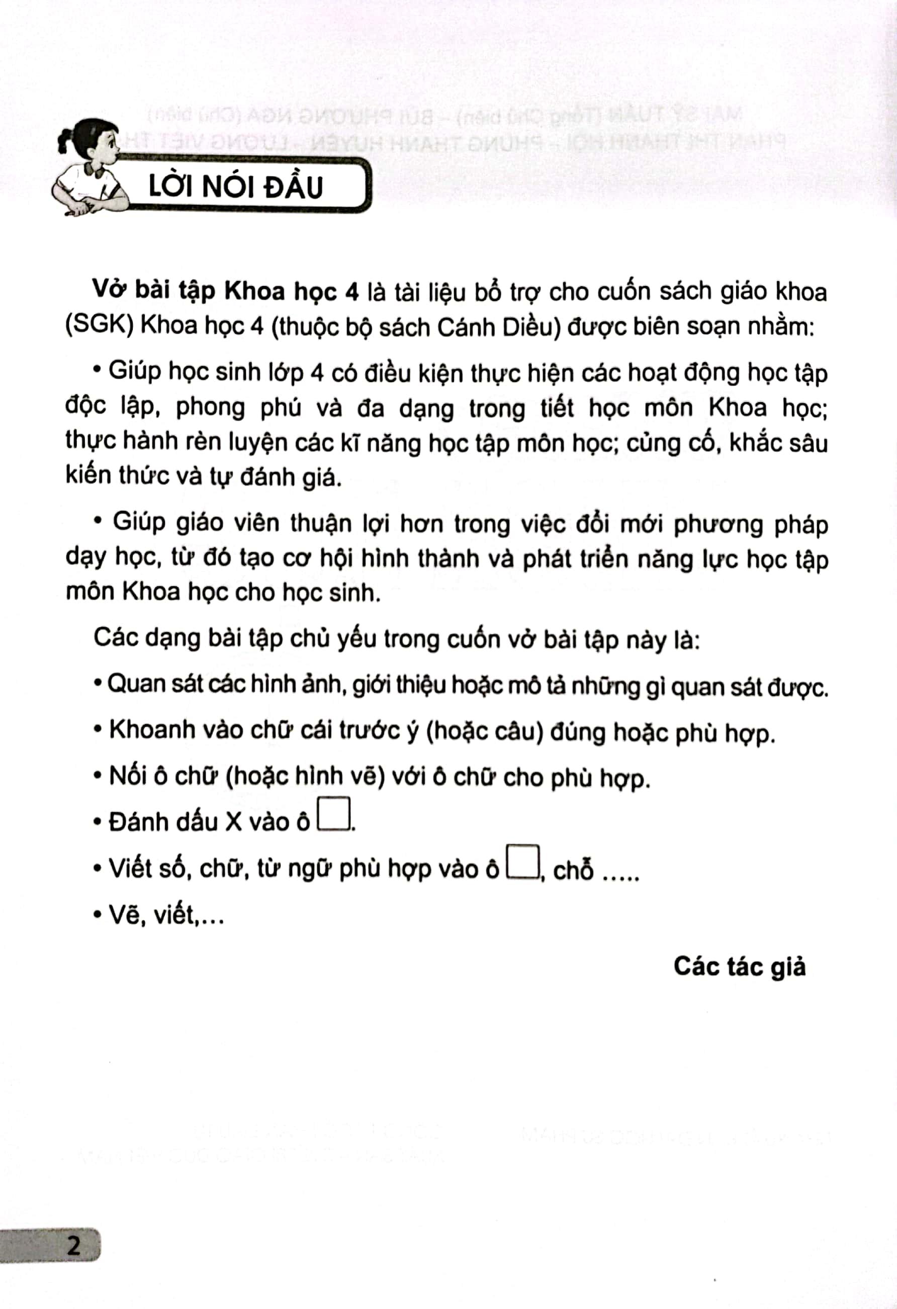 Sách giáo khoa Vở Bài Tập Khoa Học 4 thuộc bộ sách Cánh Diều, được biên soạn dựa trên quan điểm, mục tiêu của Chương trình Giáo dục phổ thông 2018 nhằm đáp ứng yêu cầu phát triển phẩm chất và năng lực học sinh.