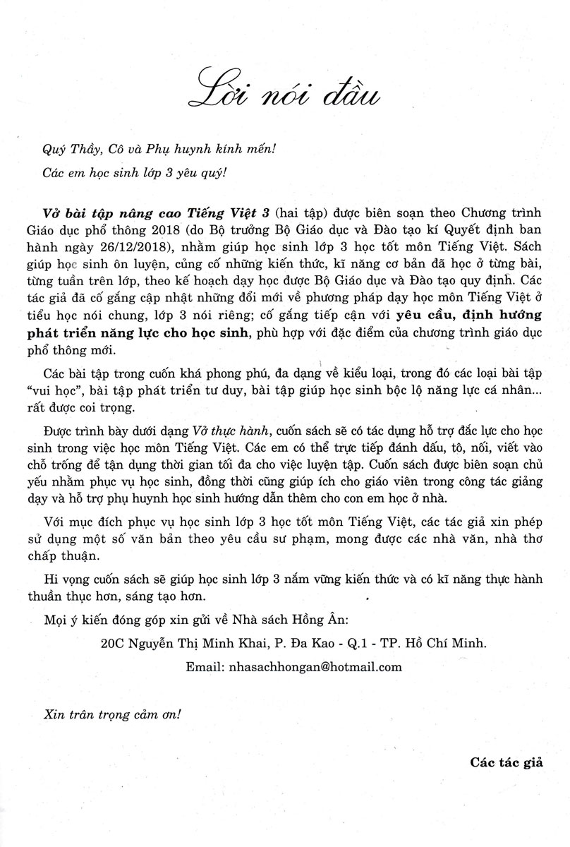 Các bài tập nâng cao này theo sát nội dung của các bài Tập đọc, Chính tả, Luyện từ và câu, Tập làm văn trong chương trình Tiếng Việt lớp 3 nhưng được thể hiện dưới nhiều hình thức luyện tập đa dạng và sát thực tế sinh động của cuộc sống .