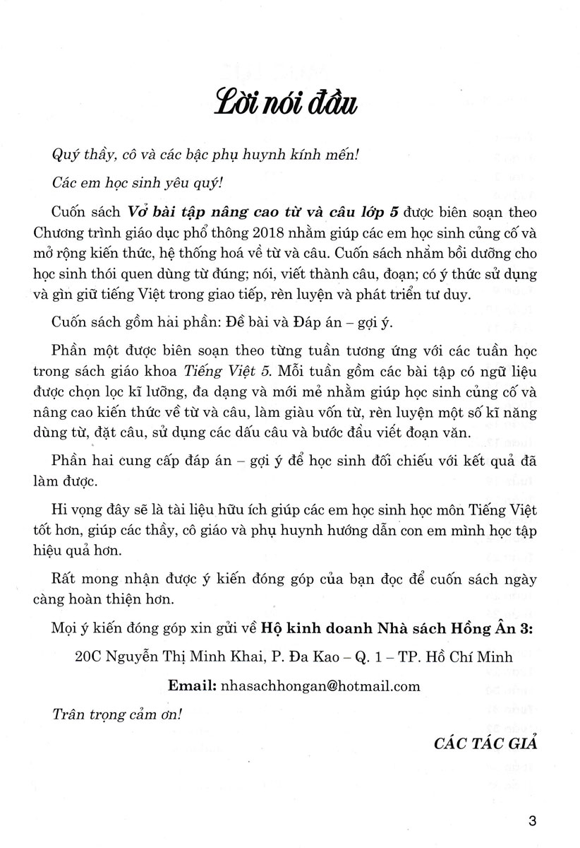 Cuốn sách Vở bài tập nâng cao từ và câu lớp 5 được biên soạn theo Chương trình giáo dục phổ thông 2018 nhằm giúp các em học sinh củng cố và mở rộng kiến thức, hệ thống hoá về từ và câu. Cuốn sách nhằm bồi dưỡng cho học sinh thói quen dùng từ đúng; nói, viết thành câu, đoạn; có ý thức sử dụng và gìn giữ tiếng Việt trong giao tiếp, rèn luyện và phát triển tư duy.