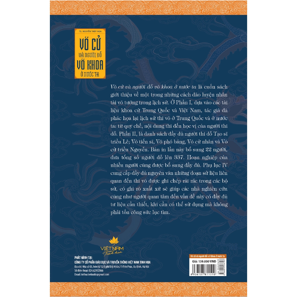Võ cử và những người đỗ võ khoa là một vấn đề còn ít được bàn luận trong giới nghiên cứu cũng như độc giả ở nước ta hiện nay. Vì vậy, cuốn sách của TS. Nguyễn Thúy Nga có thể coi là chuyên luận đầu tiên trình bày một cách có hệ thống về lịch sử hình thành, tên gọi, thể lệ và danh sách những người thi đỗ võ cử- võ khoa ở Việt Nam tính đến thời điểm hiện tại (2019).