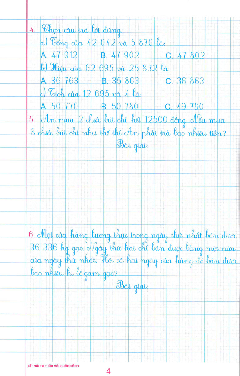 Để khắc sâu những kiến thức toán học, ngoài những bài tập trong sách giáo khoa các em học sinh cần luyện tập thêm bài tập trong các sách bài tập. Đặc biệt, các em học sinh tiểu học thường ham chơi, hiếu động dễ quên đi những kiến thức trên lớp nếu về nhà không ôn luyện lại. Cuốn sách được biên soạn bám sát chương trình sách giáo khoa hiện hành, giúp các em tự học tại nhà một cách hiệu quả. Đặc biệt, hình thức vở kẻ ô li giúp các em rèn viết chữ sạch, đẹp, trình bày rõ ràng.