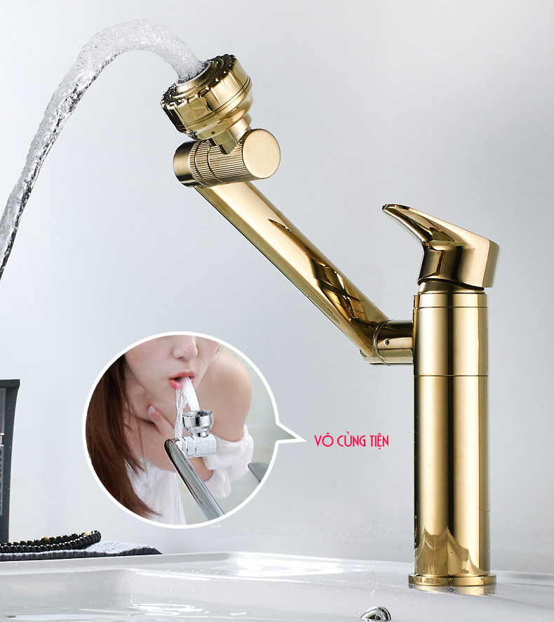 Vòi rửa mặt Lavabo cổ xoay 720 độ đa chiều, củ đồng, thân cao, mạ vàng, điều chỉnh nhiều chế độ tia nước Minh House