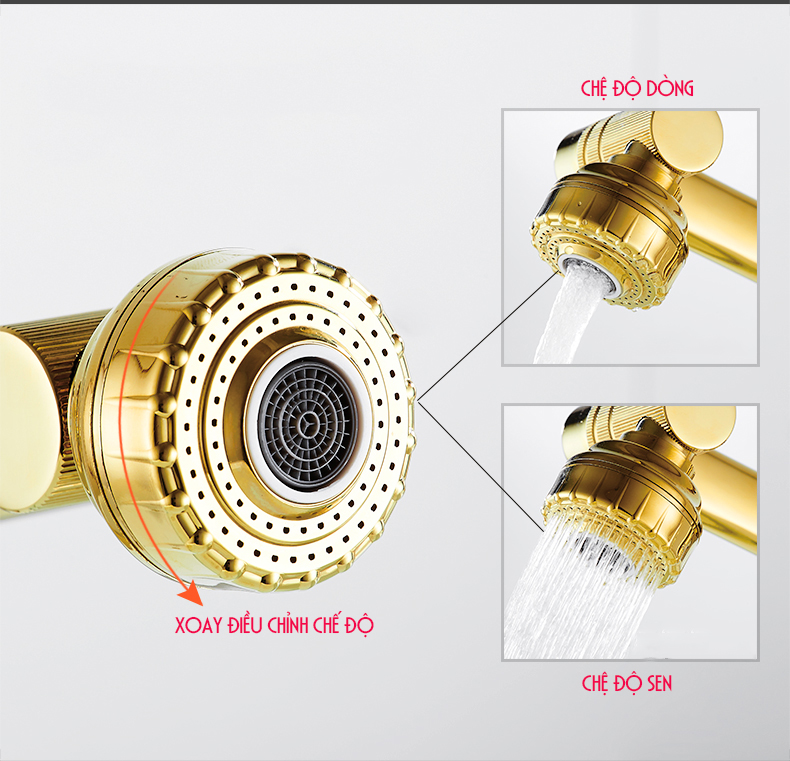 Vòi rửa mặt Lavabo cổ xoay 720 độ đa chiều, củ đồng, thân ngắn, mạ vàng, điều chỉnh nhiều chế độ tia nước Minh House