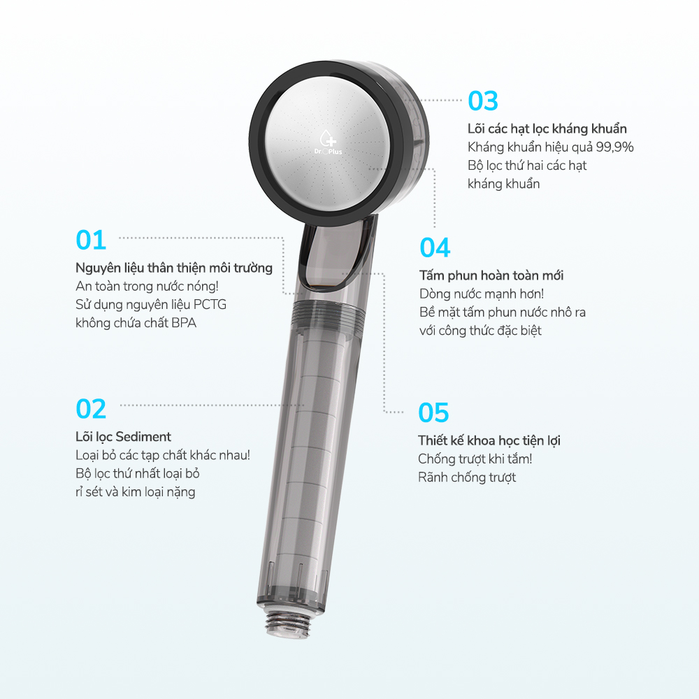 Bộ sản phẩm gồm: 01 đầu vòi sen, 01 bộ hạt lọc kháng khuẩn, 01 bộ lọc cặn