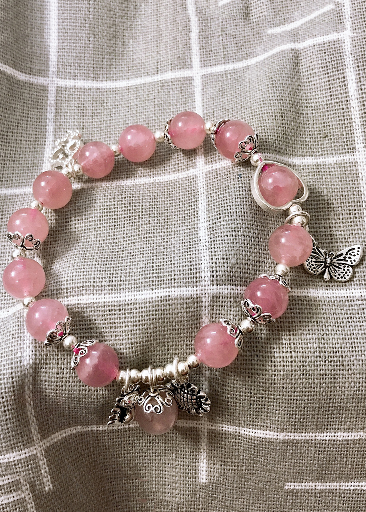 VÒNG TAY ĐÁ THẠCH ANH HỒNG AAA MIX CHARM LỤC TỰ ĐẠI MINH CHÚ: Theo thần thoại, Thần Tình Yêu đã ban tặng cho con người món quà tình yêu dưới dạng Thạch Anh Hồng.