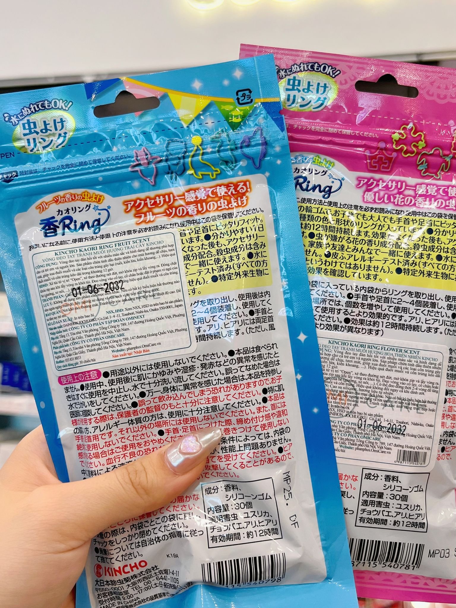 THÀNH PHẦN: Cao su silicone, hương liệu tự nhiên. CÔNG DỤNG Vòng đeo tay đàn hồi tốt với nhiều màu sắc và hình dạng dễ thương phù hợp cho cả trẻ em và người lớn. Sản phẩm chứa tinh dầu thiên nhiên cho mùi hương dễ chịu, tươi mát, giúp xua đuổi muỗi và các loại côn trùng gây hại (ruồi, kiến lửa, kiến khoang,...). Hiệu quả đuổi muỗi và côn trùng kéo dài trong khoảng 12 giờ. CÁCH DÙNG Hướng dẫn sử dụng: Xé túi từ vị trí “Open”, xé theo đường nét đứt, mở khóa zip và lấy vòng ra. Đóng chặt khóa zip sau khi lấy vòng ra khỏi túi. Đeo vòng vào cổ tay, cổ chân hoặc đặt ở phạm vi ngủ của bé (giường, xe nôi, ...). Có thể đeo đồng thời 2-4 vòng để tăng hiệu quả đuổi muỗi và côn trùng. BẢO QUẢN LƯU Ý: Không sử dụng sản phẩm cho mục đích khác. Nếu có bất kỳ biểu hiện bất thường nào như ngứa ngáy, mẩn đỏ, hãy ngừng sử dụng và rửa sạch vị trí tiếp xúc bằng nước. BẢO QUẢN: Nơi khô ráo, thoáng mát. Tránh tiếp xúc ánh sáng trực tiếp hoặc nhiệt độ cao. Để xa tầm tay trẻ em. NHÀ SẢN XUẤT DAINIHON JOCHUGIKU Co.,Ltd. 1-4-11, Tosabori, Nishi-ku, Osaka 550-0001, Japan.