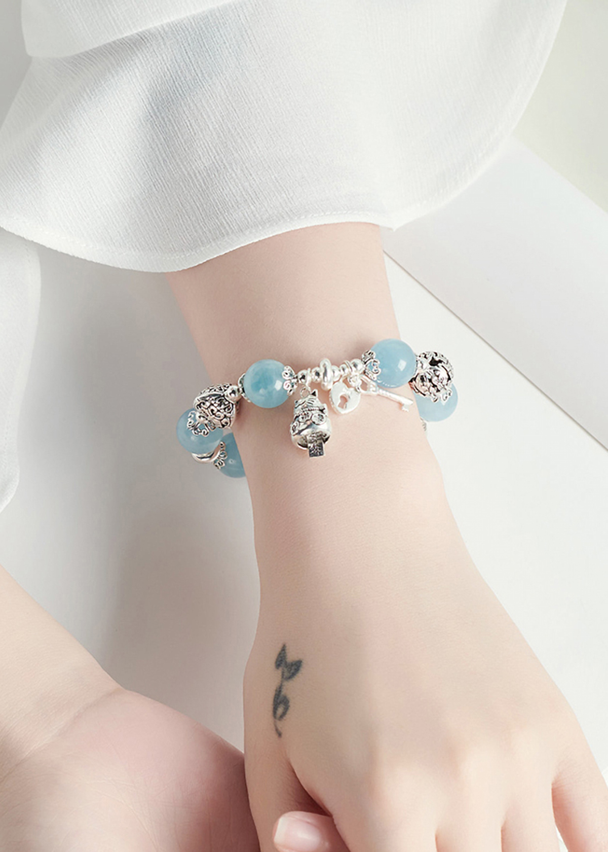 VÒNG TAY ĐÁ AQUAMARINE PHỐI CHARM MÈO BẠC: