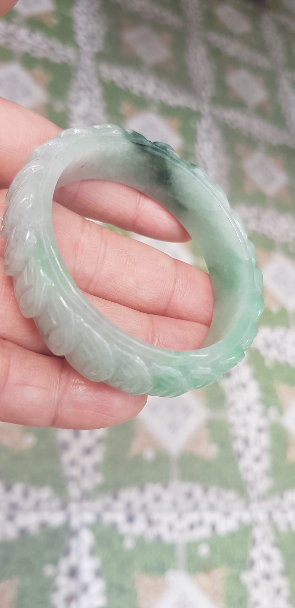 ✨Vòng tay đá ngọc Cẩm Thạch dãy Đồng Tiền Tự nhiên Size 48mm x cao 13mm x dầy 7mm Màu trắng bóng ngọc ngà điểm xanh nhẹ đẹp may mắn tài lộc Nữ mệnh kim mệnh thủy tay nhỏ 35kg - 48kg đeo ạ