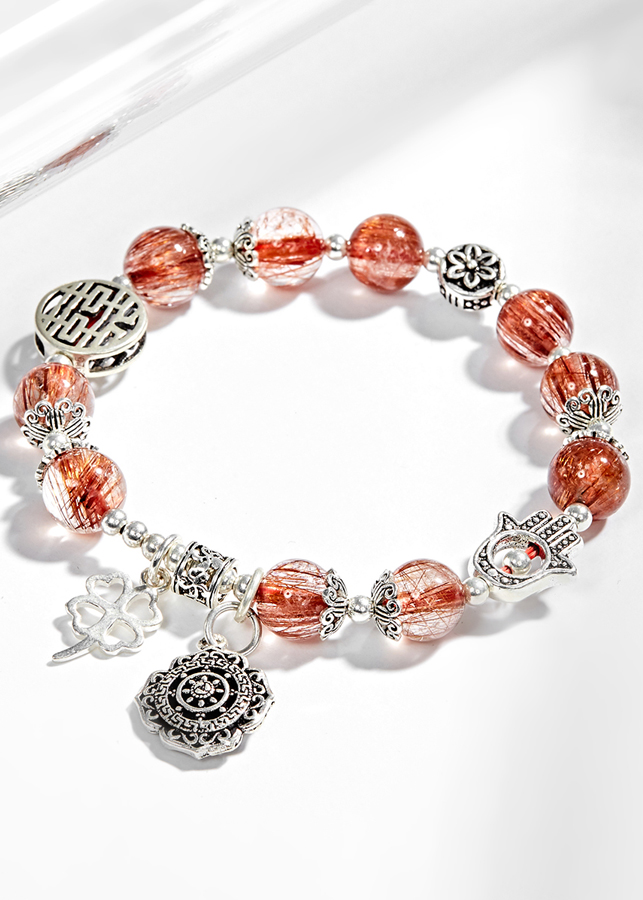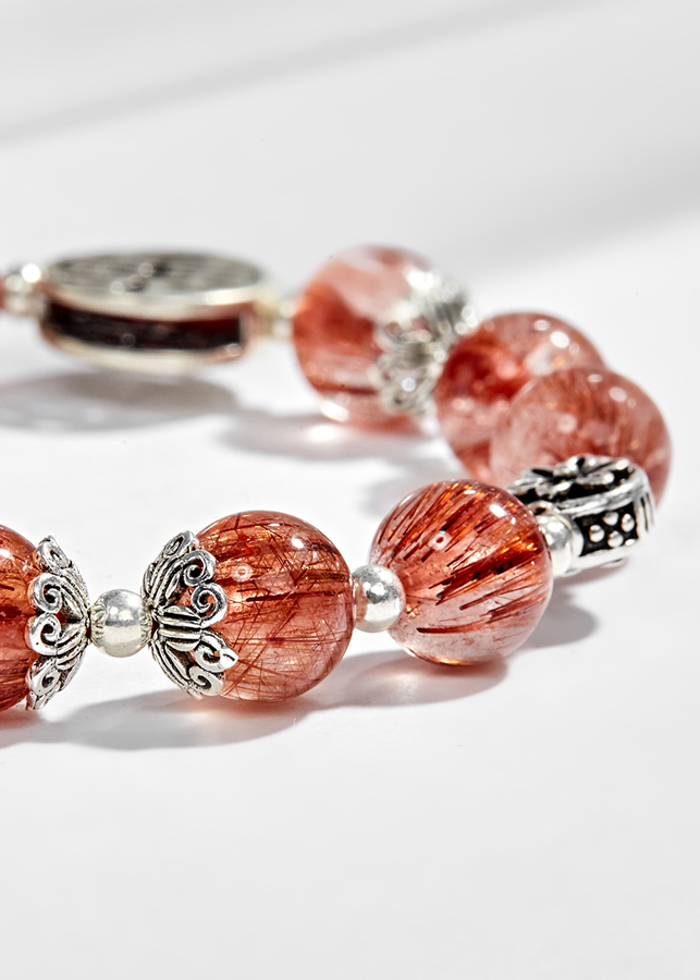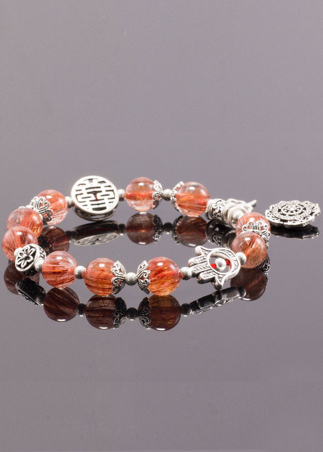 - Vòng Tay Đá Thạch Anh Tóc Đỏ Đồng Trục Phối Charm Bạc (8mm) sẽ giúp những bạn nữ có thể chất yếu và khí huyết không ổn định bổ sung năng lượng cho 3 vùng dưới (mông, rốn, thái dương) giúp cho khí huyết lưu thông điều hòa hơn.