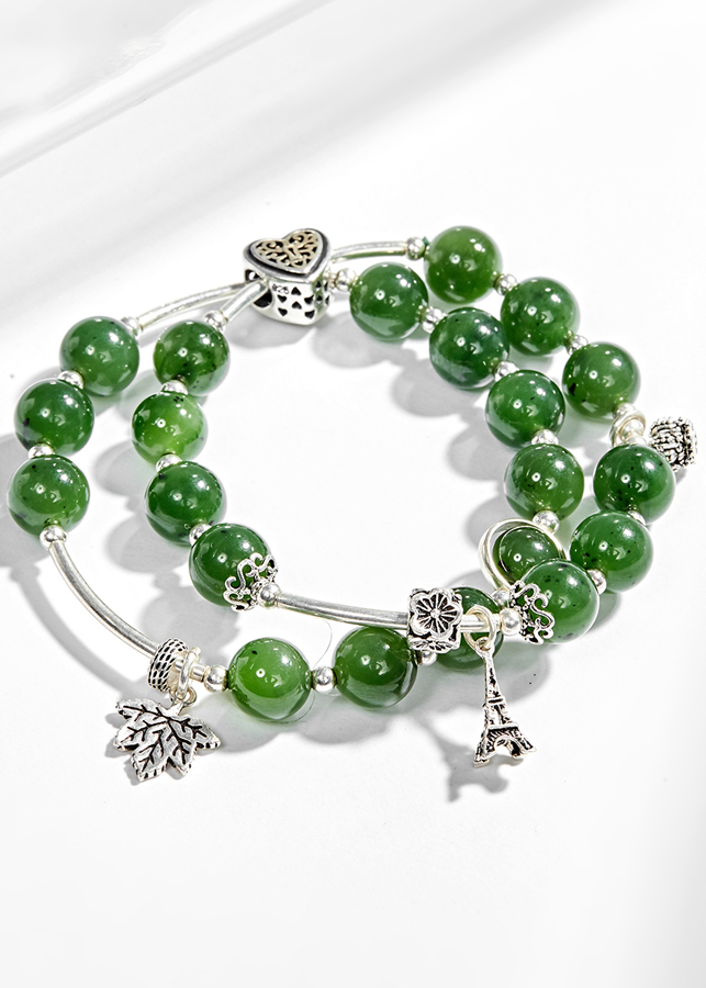 Vòng tay đôi ngọc bích phối khóa trái tim (8mm) phù hợp với người mệnh Mộc và mệnh Hoả, mang lại may mắn và giúp làm cho mối quan hệ của bạn với cấp trên và đồng nghiệp trở nên suôn sẻ.
