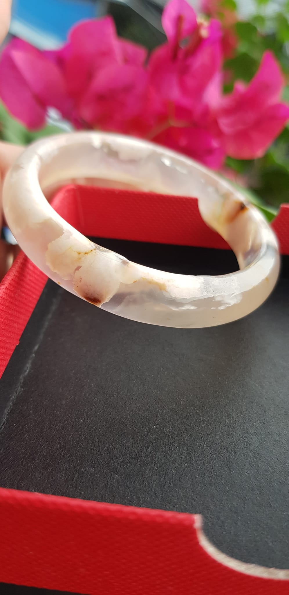 Vòng tay phong thuỷ Nữ Bản Hẹ Đá Mã Não trắng vàng nhẹ bông hoa bóng đẹp Vòng tay Nữ Ni 48mm x Cao 11mm x dầy 6mm Nữ tay nhỏ cân nặng 30kg -