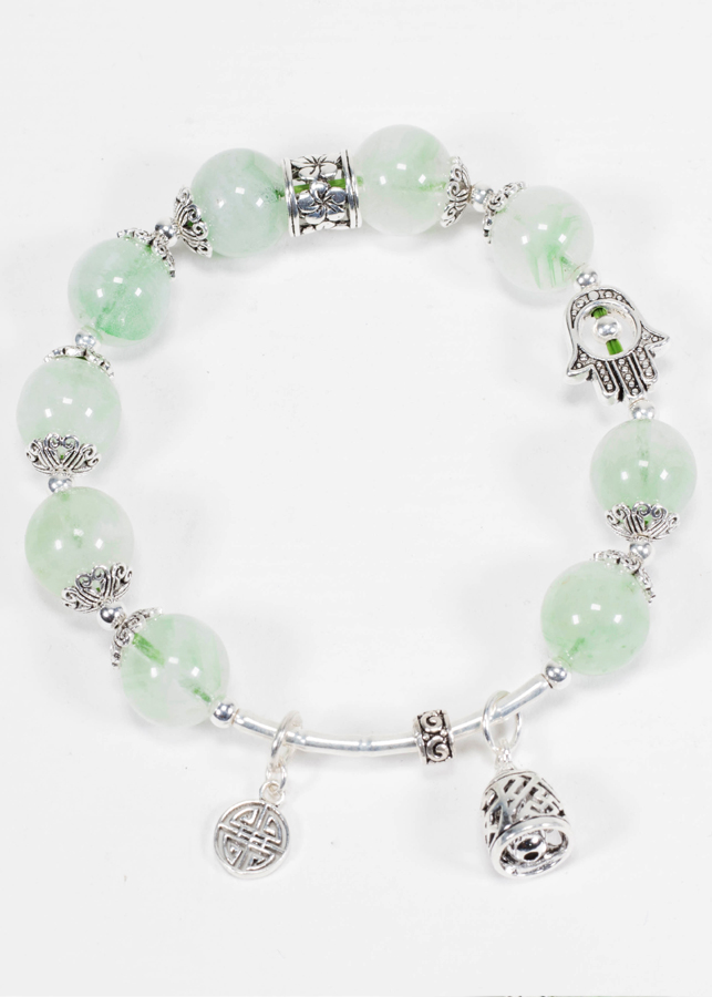 - Vòng Thạch Anh Xanh Phối Charm Chuông Bạc (8mm) giúp xoa dịu cơn giận dữ và lấy lại cảm xúc bình tĩnh. Màu xanh lá cây mang đến một cảm giác cân bằng và