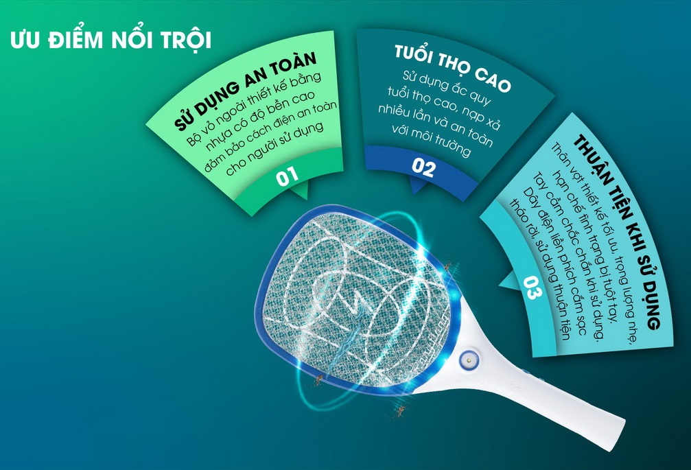 - Sản phẩm có 2 chế độ hoạt động: Diệt muỗi; Diệt muỗi và chiếu sáng bằng đèn LED. AN TOÀN SỨC KHỎE Sử dụng vợt bắt muỗi để tiêu diệt muỗi và các loại côn trùng khác là phương pháp hiệu quả phòng ngừa các bệnh do muỗi gây nên và nói không với các loại hóa chất như thuốc diệt muỗi, kem chống muỗi…, bảo vệ sức khỏe cho cả gia đình. TIÊU DIỆT MUỖI NHANH CHÓNG Chao vợt có diện tích bắt muỗi rộng, lưới vợt thiết kế 3 lớp bằng vật liệu thép mạ và vật liệu nhôm giúp tiêu diệt muỗi nhanh chóng. ỨNG DỤNG LINH HOẠT Sản phẩm thích hợp sử dụng để tiêu diệt muỗi trong các gia đình đặc biệt gia đình có trẻ nhỏ hoặc tại các nơi như chợ, cửa hàng, văn phòng hay bất kỳ nơi nào có nhiều muỗi.