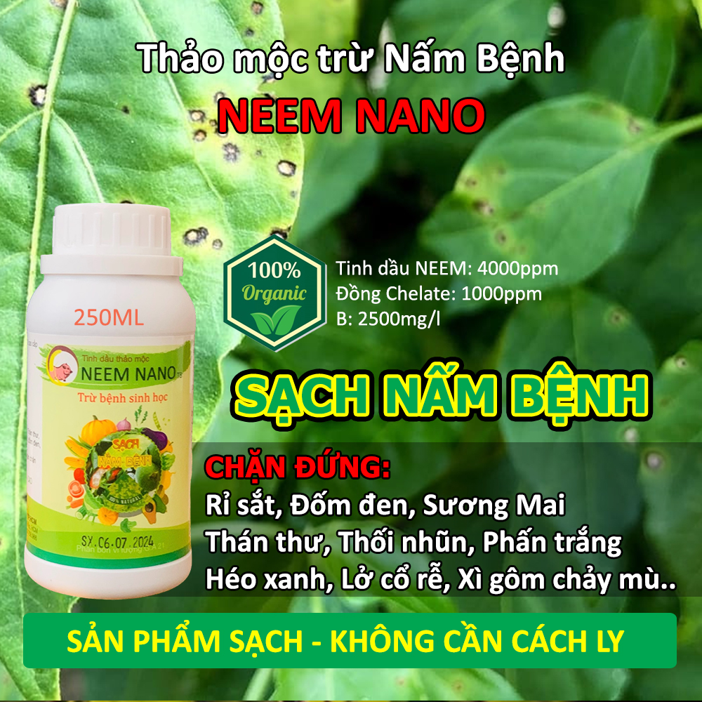 – Thuốc trừ nấm bệnh sâu sinh học NEEM NANO phòng trị nhiều loại nấm khuẩn gây hại trên cây trồng như: Thán thư, thối nhũn, phấn trắng, sương mai, héo xanh, rỉ sắt, đốm đen, lở cổ rễ, xì gôm chảy mủ, vàng lá…