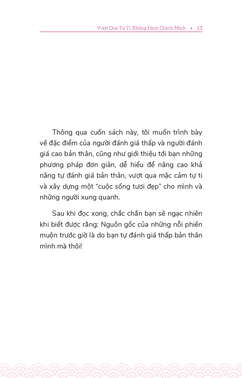 - Giới thiệu Vượt Qua Tự Ti - Khẳng Định Chính Mình Bất kể trong công việc hay cuộc sống, tự tin luôn là yếu tố hàng đầu dẫn dắt chúng ta tới thành công Thế nhưng, có không ít người lại có khuynh hướng đánh giá thấp bản thân, luôn tự chỉ trích chính mình, không ngừng bận tâm đến ánh mắt của người đời hoặc cố gắng tỏ ra khiêm tốn để được mọi người yêu mến. Bạn có đang rơi vào tình trạng tương tự như vậy không? Nếu có, VƯỢT QUA TỰ TI, KHẲNG ĐỊNH CHÍNH MÌNH là bí quyết giúp bạn thay đổi cuộc đời mình. Thông qua những hình ảnh minh họa sinh động, tác giả Nobuyori Oshima sẽ cung cấp nhiều phương pháp đơn giản mà hiệu quả nhằm giúp bạn từng bước nâng cao sự tự tin, biết cách đánh giá đúng mức bản thân và xây dựng cuộc sống mà bạn mong muốn.