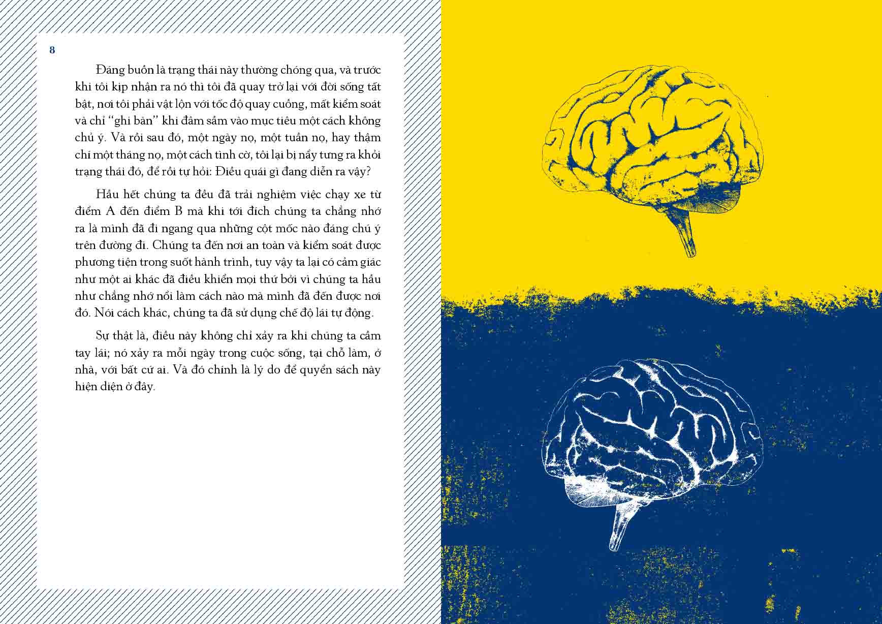 Tác giả: Chris Baréz Brown Người dịch: Thanh Thảo Nhà xuất bản: NXB Tổng Hợp TP.HCM Nhà cung cấp: First News - Trí Việt Khổ sách: 14,5 x 20,5 cm Số trang: 312 Cuộc đời là kết quả của tất cả những gì ta lựa chọn. Đáng buồn thay, phần lớn những lựa chọn của chúng ta trong một ngày đến từ cơ chế “lái tự động” của bộ não – hay những hành động theo thói quen và tiềm thức. Bớt lệ thuộc vào chế độ “lái tự động” sẽ giúp ta tạo nên sự khác biệt vô cùng lớn trong đời sống hằng ngày. Ý tưởng chủ đạo của cuốn sách “Xoay tư duy chuyển cuộc đời là khi ta “thường xuyên “đánh thức” chính mình một cách có chủ đích, ta có thể tác động sâu sắc đến chất lượng cuộc sống của chúng ta, những quyết định và niềm vui sống nói chung. Và khi chúng ta càng làm thường xuyên, cơ chế “lái tự động” sẽ dần suy yếu đi, tiềm thức quen thuộc sẽ đóng vai trò hỗ trợ thay vì dẫn dắt chúng ta trong đời sống. Với một mục tiêu “nặng nề” như vậy, nhưng cách tiếp cận của cuốn sách “Xoay tư duy chuyển cuộc đời” lại khá sáng tạo và sinh động. Thay vì đưa ra những lý thuyết khó hiểu, phần lớn cuốn sách là những bài tập “tĩnh tâm” bằng những hoạt động vui vẻ, đòi hỏi hoạt động liên tục và mang tính thực nghiệm có thể dễ dàng áp dụng với tất cả mọi người. Não bộ con người làm việc ở hai trạng thái: Ý thức và tiềm thức. Trong đó, bộ não ý thức được sử dụng cho các quá trình liên quan đến lô-gic, lý lẽ và các cấp độ xử lý nhận thức cao hơn. Ngược lại, bộ não tiềm thức giỏi nhận ra những kiểu mẫu và sự tương đồng trong những việc chúng ta đang trải nghiệm trong hiện tại so với những gì chúng ta đã từng trải nghiệm trước đây. Điểm đặc biệt là bộ não tiềm thức thường được chúng ta sử dụng như một cách tiết kiệm năng lượng não bộ. Tuy vậy, nó lại không có “công tắc tắt nguồn”, dẫn đến việc chúng ta có khuynh hướng sống theo thói quen, để cho bản năng sẽ nắm quyền quyển soát. Từ đó, ta dễ xao lãng và “trôi theo” những thói quen sai lầm, không tốt cho sức khỏe, thậm chí ngăn cản sự phát triển tích cực của bản thân và nội tâm. Cuốn sách bao gồm 56 lời gợi ý được chia ra thành các chủ đề: Hít thở, hòa nhịp, khơi nguồn sức mạnh, kết nối, lắng nghe cơ thể, lạc vào âm nhạc. Mỗi lời gợi ý được cấu trúc thành 3 phần: Góc nhìn mới, kế hoạch thực hiện, thành quả và một góc ghi chú cho bạn đọc. Những hành động này không quá “cao siêu” mà được bắt đầu từ việc thay đổi những thói quen rất nhỏ như việc hạn chế xem tivi, tập xếp máy bay, vẽ tranh, đi dạo trong rừng đến tập pha trà và thả mình vào âm nhạc… Với mỗi lời khuyên, tác giả cũng dành một phần giải thích nguyên nhân và kết quả đạt được nếu bạn áp dụng theo những phương pháp đó. “Nếu mọi việc có vẻ khó khăn và gây đau đớn thì có thể là do bạn không sống tích cực. Nếu mọi người xung quanh đều có vẻ không đáng tin thì thường là do chúng ta không rõ ràng về những gì chúng ta muốn gắn kết để làm cho cuộc sống này trở nên thật đặc biệt. Nếu chúng ta không tìm thấy đủ tình yêu thương trong cuộc sống thì thường là do chúng ta đã không dành đủ yêu thương cho bản thân” – Tác giả Chris Baréz-Brown kết luận.
