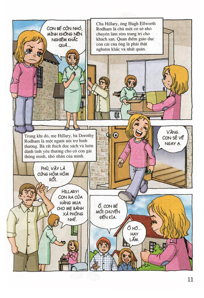 Từ một cô bé nhút nhát, Hillary Clinton đã dần trở thành một nữ lãnh đạo kiệt xuất của nước Mĩ, được cả thế giới ngưỡng mộ, nể phục. Từ thời còn là sinh viên cho tới khi trở thành phu nhân Tổng thống Mĩ, Hillary Clinton vẫn luôn quan tâm tới trẻ em, người nghèo và nỗ lực không ngừng để cải cách lĩnh vực giáo dục và y tế. Bạn nhỏ hãy học ở đệ nhất phu nhân Hoa Kì tính cách cương trực, thẳng thắn, sẵn sàng bênh vực người yếu vì sự công bằng trong xã hội nhé!