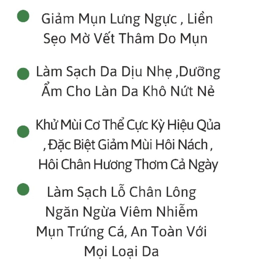 Mua tại TiktokTHÔNG TIN SẢN PHẨM Thành phần: Bạc Hà, Trầu Không, Mật ong, tinh dầu trầu không, phôi xà bông từ dầu dừ Công dụng: Giảm mùi cơ thểm, giảm mẩn ngứa do dị ứng, hết mụn lưng, làm sạch và kháng khuẩn da. Đối tượng sử dụng: Những bạn bị mụn lưng, thâm sạm và viêm lỗ chân lông, hôi chân, hôi nách, mùi cơ thể , KLT: 100g/ bánh HSD: 18 tháng kể từ NSX