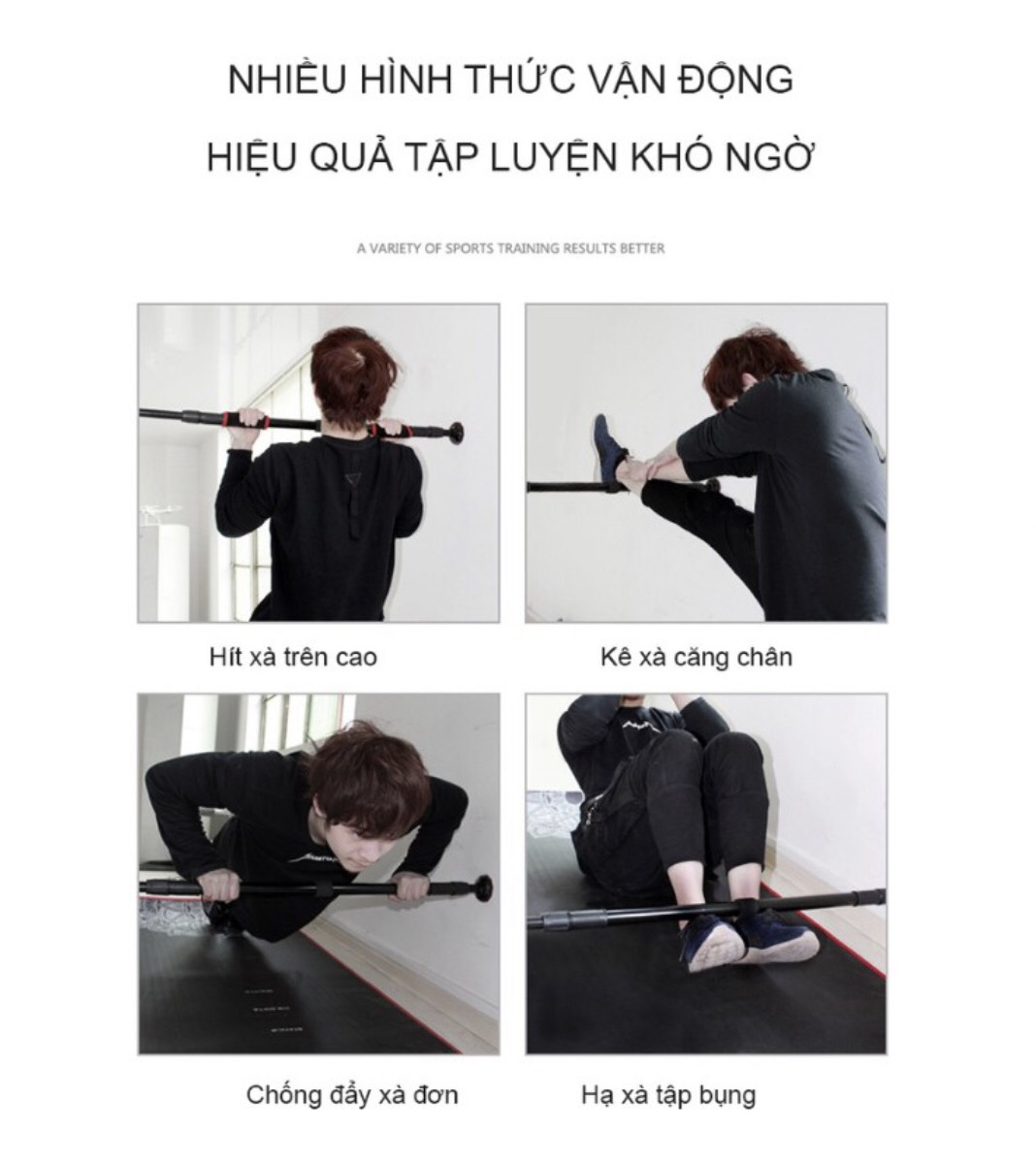 Thông tin chi tiết sản phẩm Xà đơn gắn cửa 2021 - Chất liệu chính: Ống xà đơn làm bằng thép không gỉ dày 2mm, phun sơn tĩnh điện. Gồm các kích thước:
