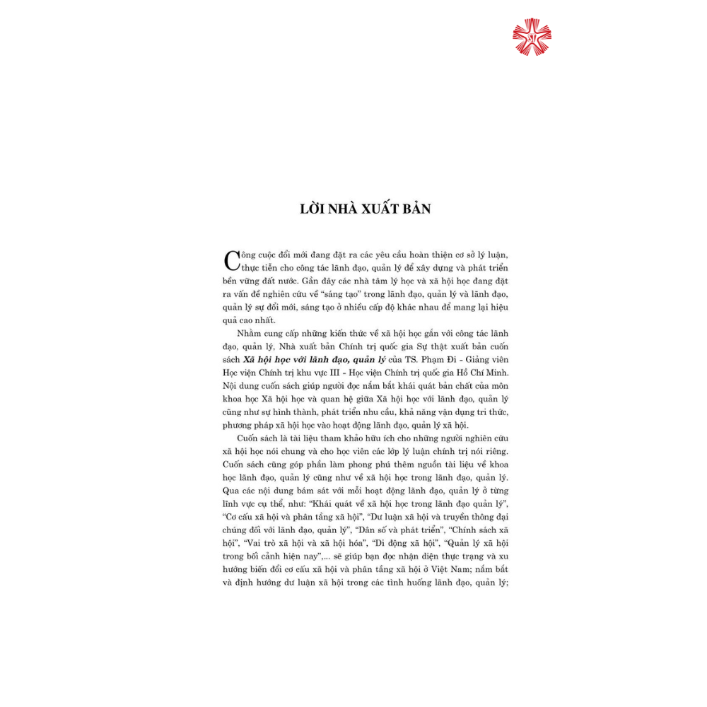 Mua tại TiktokvCuốn sách có nội dung về lý luận cơ bản của xã hội học và vận dụng được kiến thức về chức năng của xã hội học trong lãnh đạo, quản lý ở Việt Nam hiện nay để đánh giá thực trạng, phân tích nguyên nhân, dự báo xu hướng biến đổi, đề xuất được các giải pháp giải quyết các vấn đề đặt ra trong lãnh đạo quản lý. Vận dụng các phương pháp nghiên cứu xã hội học vào công tác lãnh đạo quản lý.
