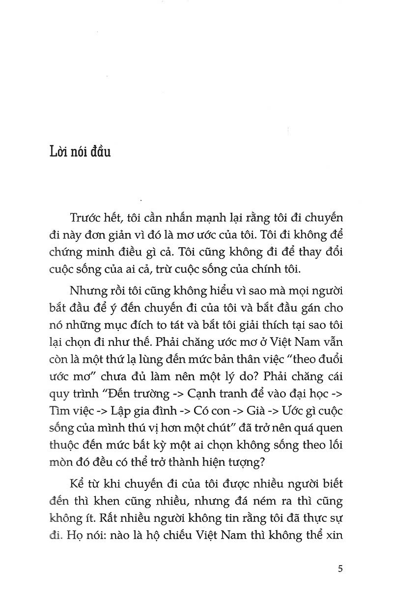 Là cuốn nhật ký sinh động, ghi lại chân thực những trải nghiệm, những điều thú vị được tai nghe mắt thấy, về những tình bạn, tình thân và tình người trong suốt hành trình mơ ước của tác giả ở nhiều quốc gia và Châu lục khác nhau.