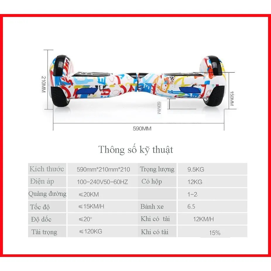 - 1 x Hộp Carton bảo vệ bên ngoài, kích thước hộp: 60 30 30cm – Tổng trọng lượng: 10.5 kg 1 x Xe 2 bánh tự cân bằng 6.5 inch 1 x Sạc pin 110-220 V 1 x Hướng dẫn sử dụng 1 x Quà tặng bộ bảo vệ 1 x Đồng hồ LED 1 x Bộ miếng dán sticker Thích hợp đi đường phẳng, hơi ghồ ghề THÔNG SỐ KỸ THUẬT XE ĐIỆN CÂN BẰNG: Dòng sản phẩm: Xe Cân Bằng Điện 6.5 inch Bluetooth Hệ thống tự cân bằng khi khởi động Hỗ trợ Bluetooth Đèn Led nhấp nháy. Tốc độ tối đa: 20-25km/h Tải trọng tối đa: 150kg ( thiết kế khung nhôm nguyên khối, chịu tải cao ) Thời gian sạc: 3-4 giờ Dung lượng pin : 4400 MAH Thời gian đi khi pin đầy: 2-3 tiếng liên tục Động cơ xe điện cân bằng: 2 động cơ 300W Hạn chế tiếp xúc mới nước Lốp xe điện: 6.5 inch bằng cao su đặc, độ ăn mòn thấp Kích thước: 65cm 24cm 23cm Trọng lượng: 8kg. Xin giới thiệu phiên bản xe điện cân bằng tự cân bằng 6.5 inch bluetooth. Ngoài các tính năng giống phiên bản thông thường, xe điện cân bằng tự cân bằng 6.5 inch bluetooth còn có thêm tay xách dễ cầm nắm để đi du lịch, đi chơi. Xe điện tự cân bằng bánh xe cỡ lớn khi không có người lái là phiên bản mới nhất với tính năng tự cân bằng giống chiếc Mini Robot Pro. Tính năng này giúp cho người lái nhất là những người mới chơi dễ dàng đứng lên xe mà không lo bị xe bị trượt về phía trước.