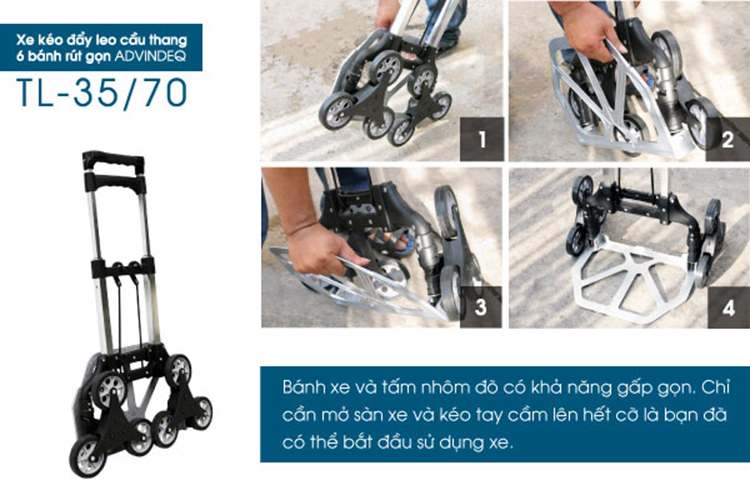 Tổng quan sản phẩm: Xe Kéo Đẩy Leo Cầu Thang 6 bánh rút gọn ADVINDEQ TL-35/70 trọng tải leo cầu thang 35 kg, đường bằng 70kg được làm bằng hợp kim nhôm có độ bền cao,